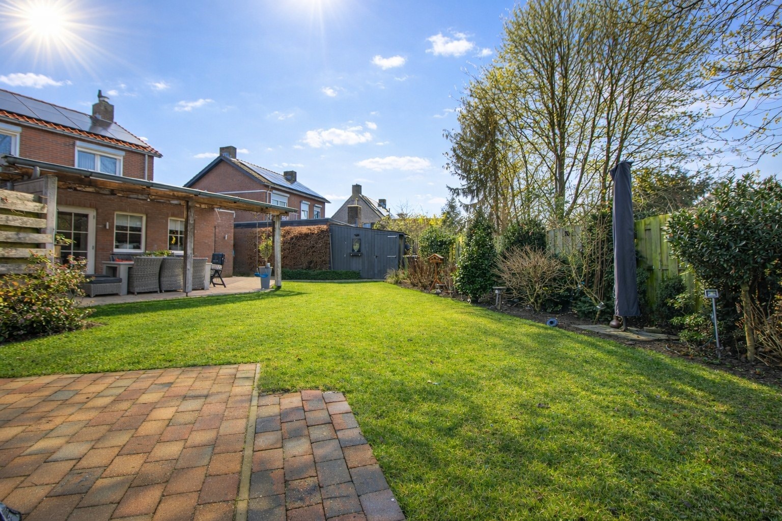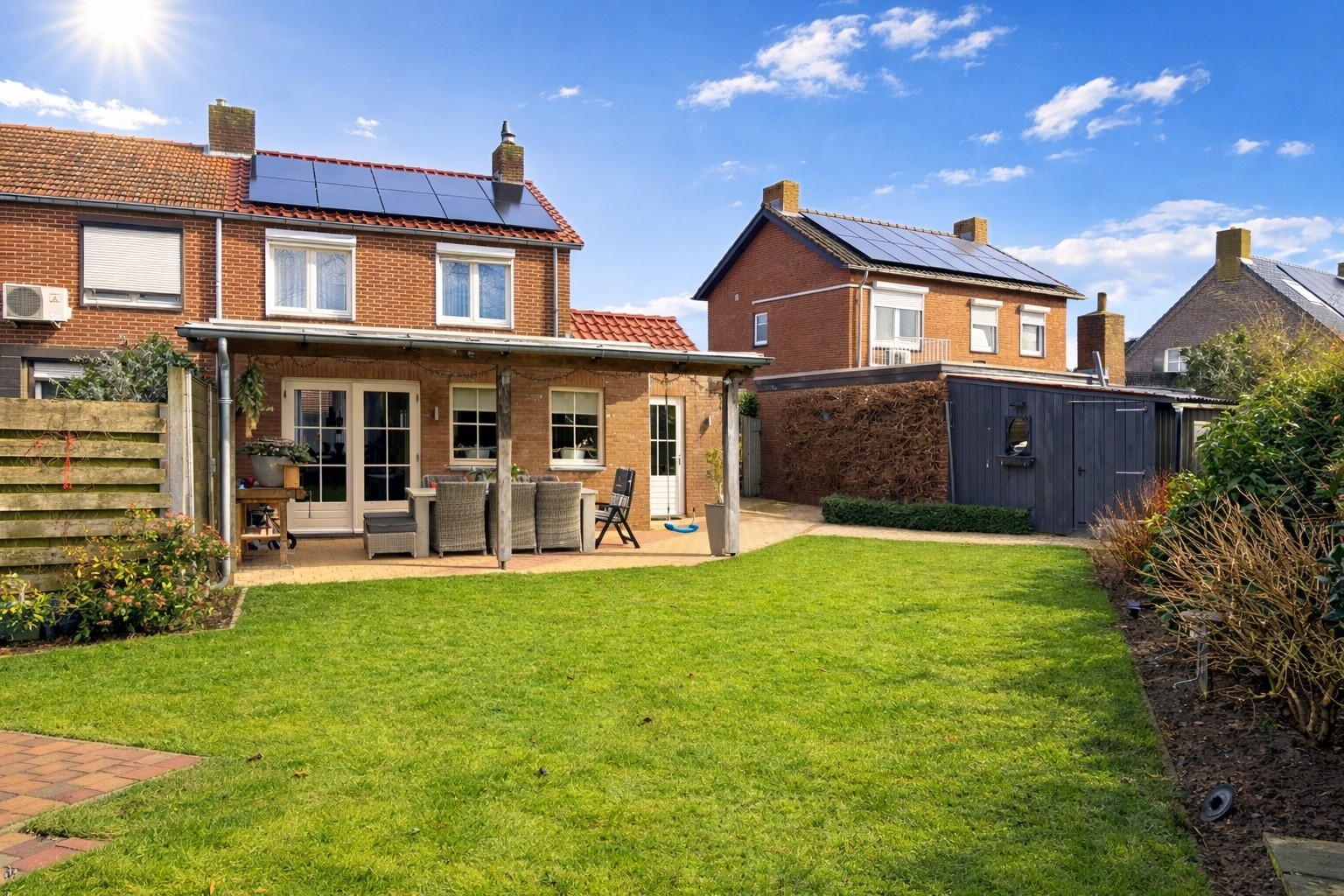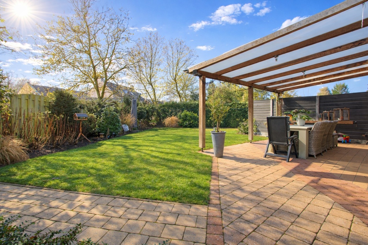 Eenmaal uitgekomen in de achtertuin middels de eigen achterom vanuit de brede oprit aan de linkerkant krijg je een waar vakantiegevoel. Een FENOMENALE terrasoverkapping, praktische houten berging (ca. 13m²) voor de tuinaccessoires. De tuin is verzorgd aangelegd en geheel omsloten en biedt een oase van rust met achter (rechts) plek voor een groot zwembad in de zomer. Het is ideaal voor de buitenmensen die in de tuin bezig zijn of zomeravonden willen verlengen met vrienden en familie, zelfs bij slechter weer onder de overkapping.