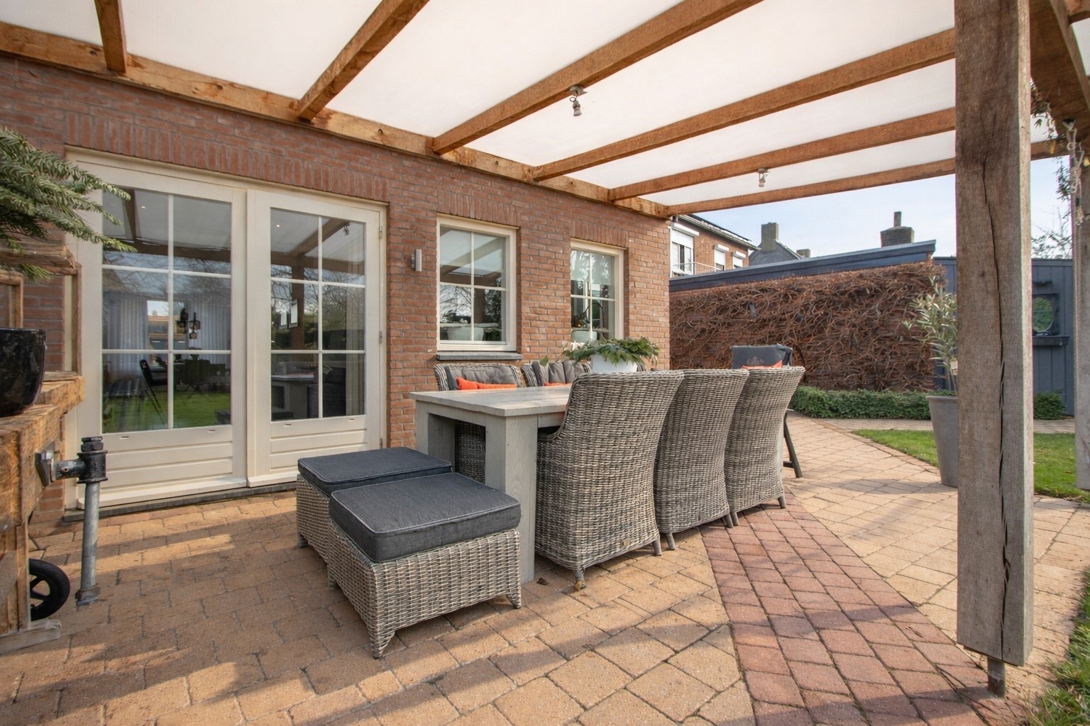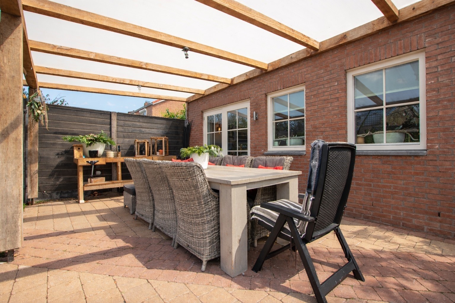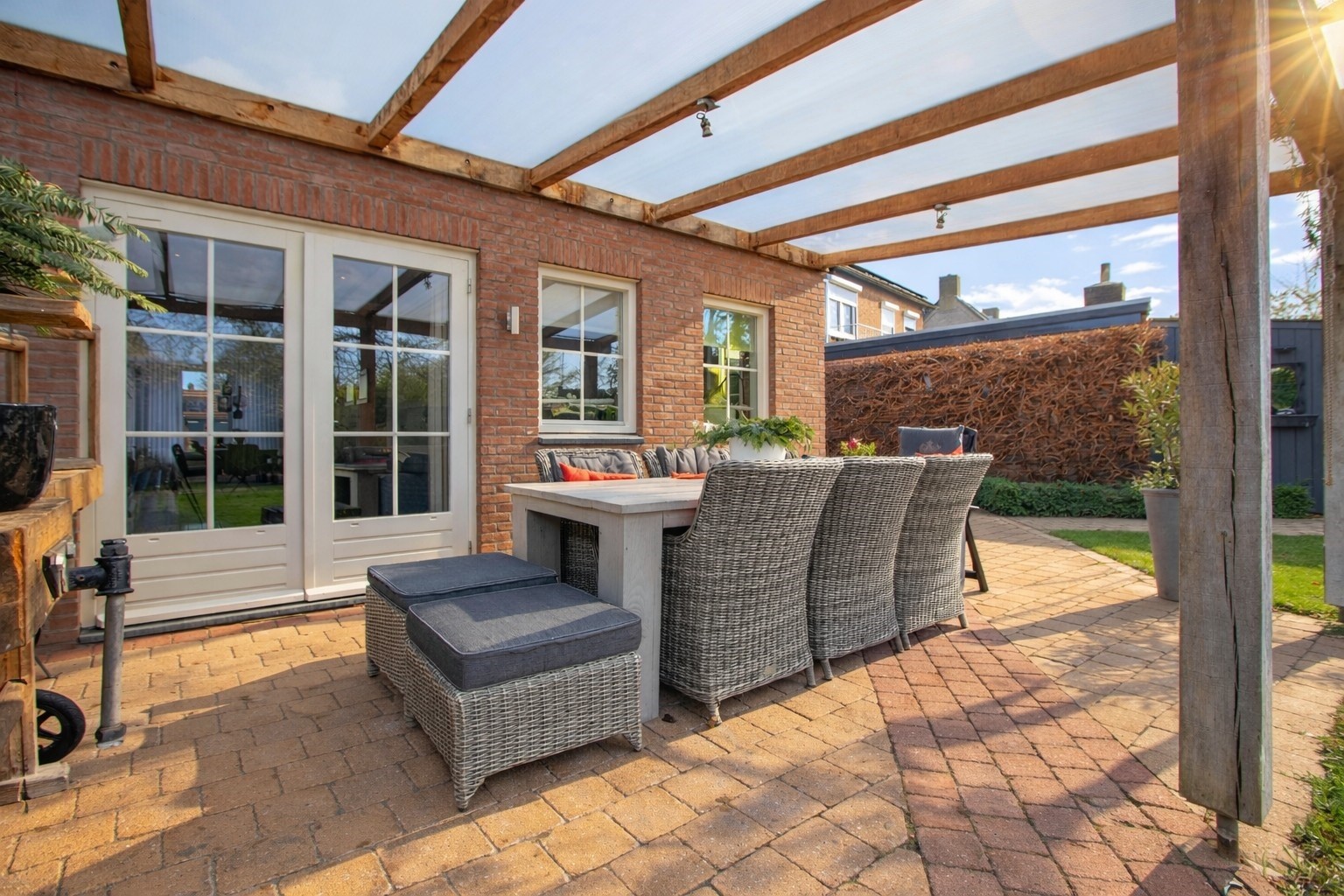 Eenmaal uitgekomen in de achtertuin middels de eigen achterom vanuit de brede oprit aan de linkerkant krijg je een waar vakantiegevoel. Een FENOMENALE terrasoverkapping, praktische houten berging (ca. 13m²) voor de tuinaccessoires. De tuin is verzorgd aangelegd en geheel omsloten en biedt een oase van rust met achter (rechts) plek voor een groot zwembad in de zomer. Het is ideaal voor de buitenmensen die in de tuin bezig zijn of zomeravonden willen verlengen met vrienden en familie, zelfs bij slechter weer onder de overkapping.