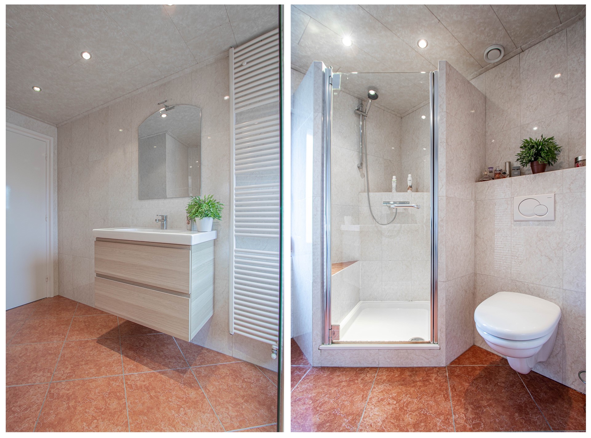 Via de vaste trap in de hal is de eerste verdieping bereikbaar met daaraan gelegen drie keurige slaapkamers en een verzorgde badkamer. De slaapkamers zijn afgewerkt met vloerbedekking en strak gestukte wanden en hebben hardhouten kozijnen met HR++ beglazing (2015) en rolluiken voor degene die in het donker wenst te slapen. De badkamer is compleet uitgevoerd en voorzien van een ruime douchecabine, wastafelmeubel, 2e toilet, design radiator en comfortabele vloerverwarming. Via een vlizotrap bereik je de tweede verdieping, momenteel in gebruik als praktische (geïsoleerde) bergruimte waar zich de HR cv-installatie bevindt.