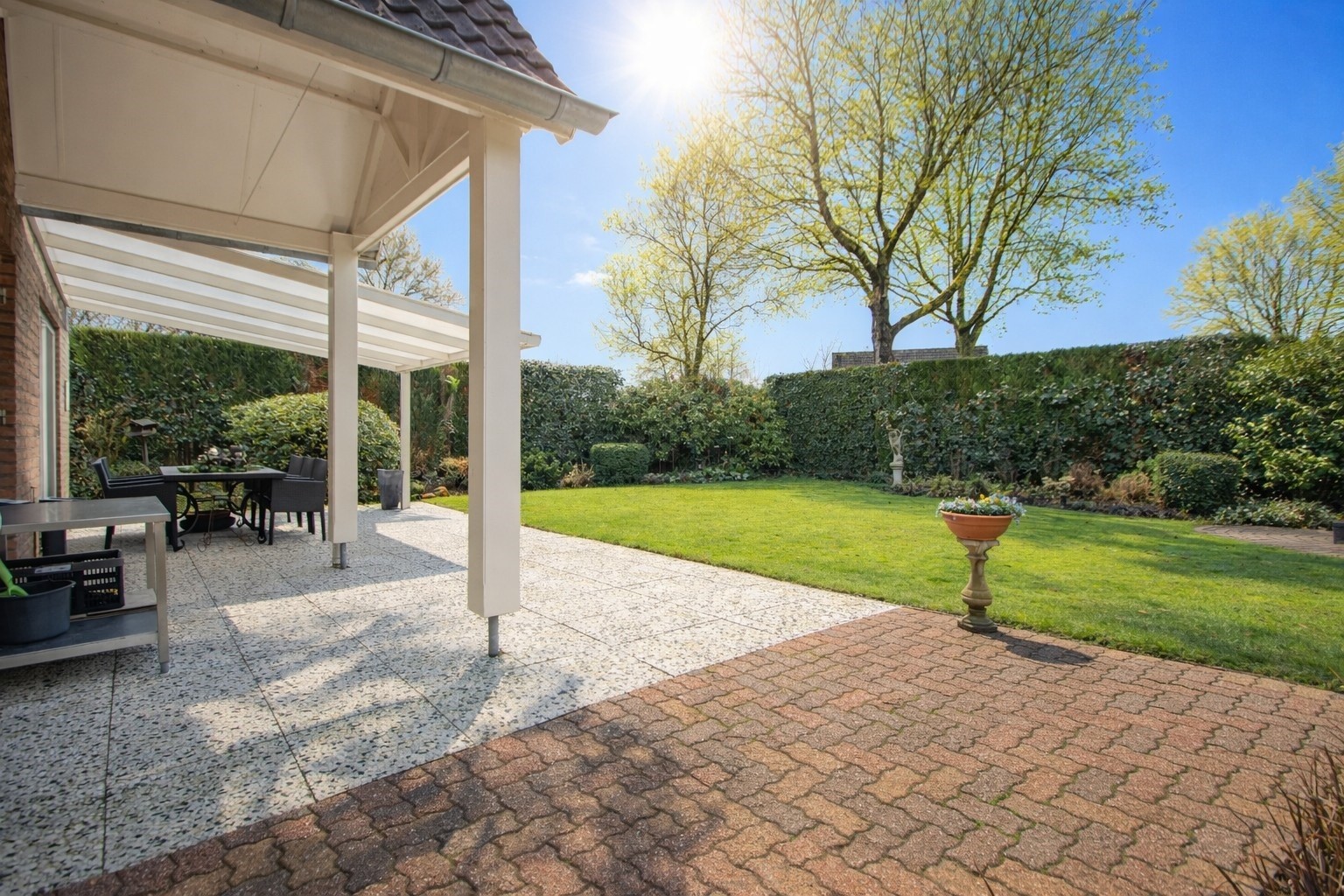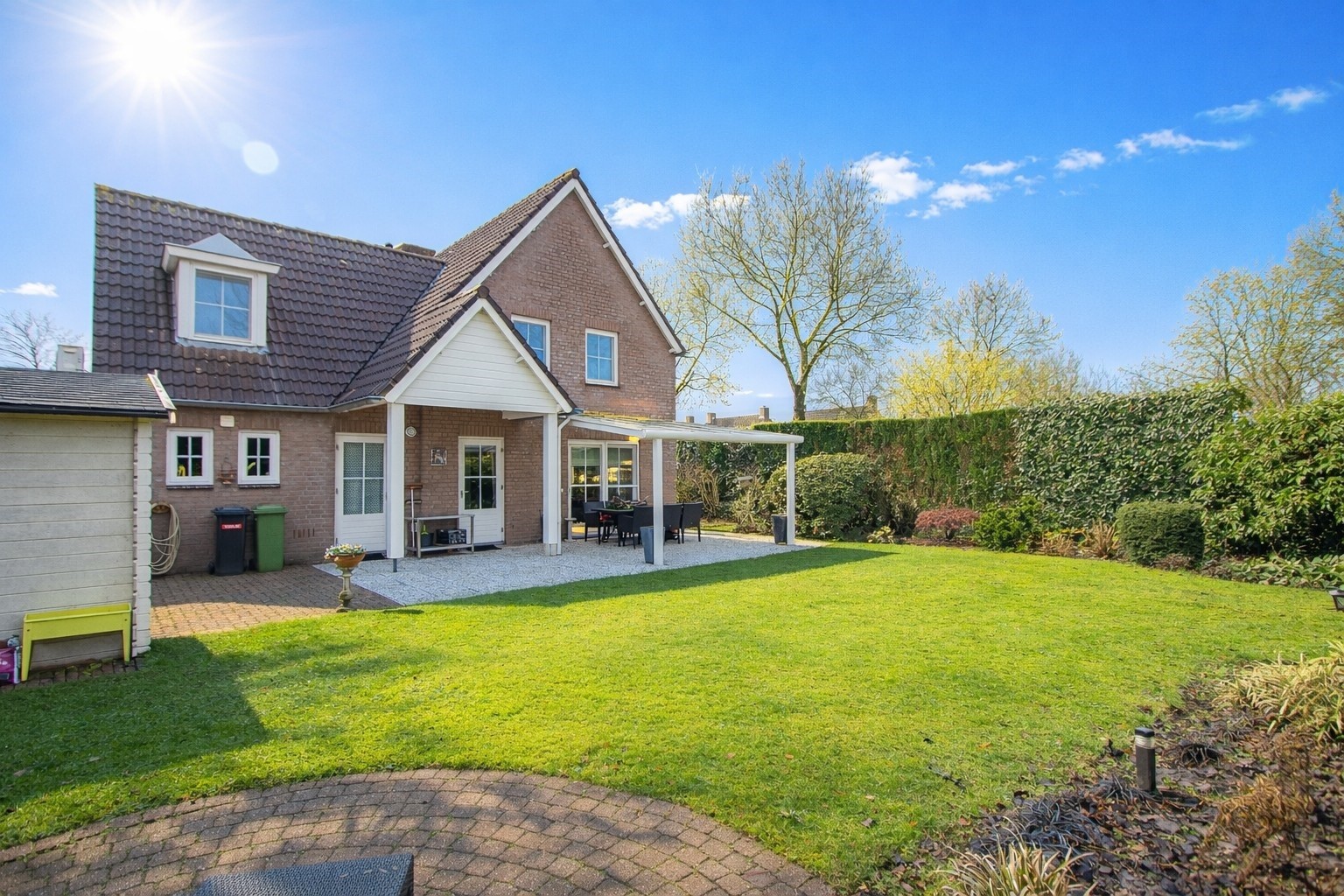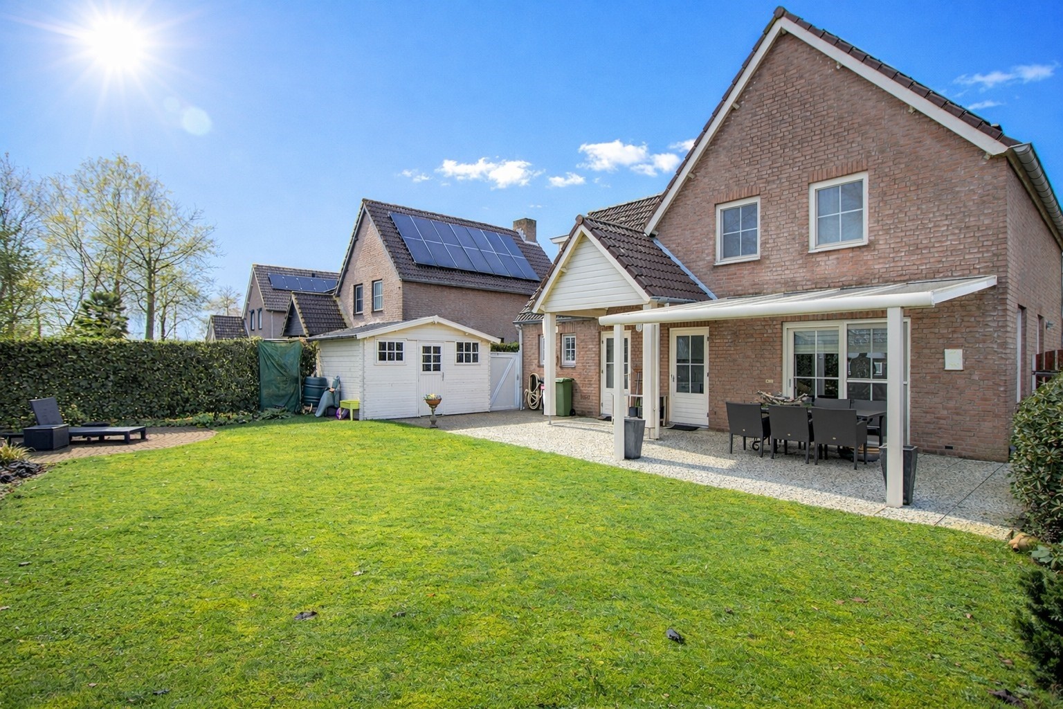 Heerlijke terrasoverkapping – graszode - plantenborders met diverse aanplant – bomen – tuinhuis - eigen achterom en ook een keurig verzorgde voortuin met een extra brede oprit.
