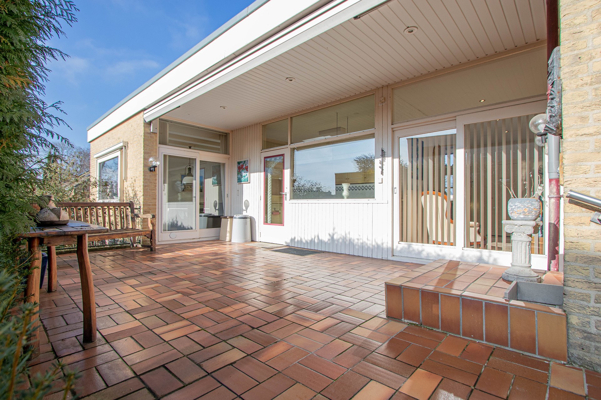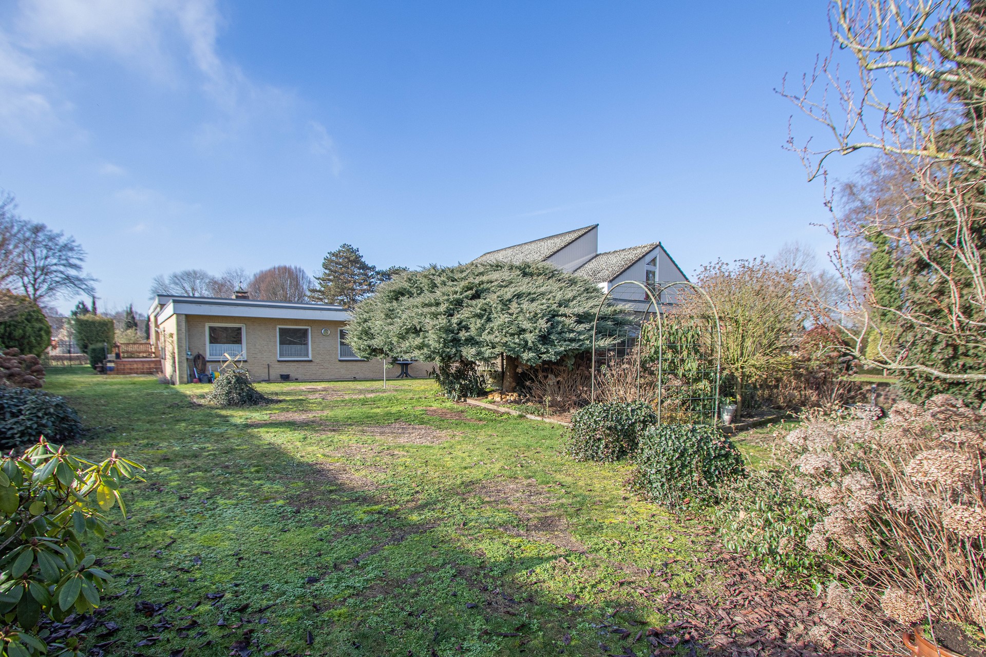 Voortuin is verzorgd aangeplant en aan de linkerzijde een oprit voor twee auto’s – aan de rechterzijde en eigen achterom/poort – deels overdekt terras met zonnescherm – graszode – diverse bomen en struiken – caravanstalling en ontzettend veel privacy.