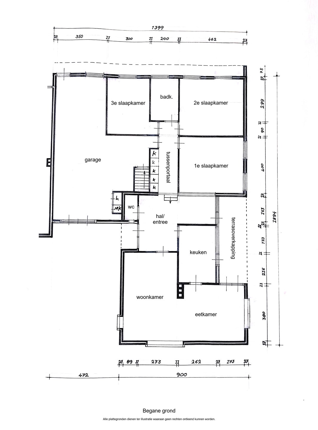 Begane grond Riante ontvangsthal/entree, gastentoilet, meterkast, eet-/woonkamer, gesloten keuken, tussenportaal met kastenwand en daaraan gelegen badkamer, drie ruime slaapvertrekken en inpandige garage.