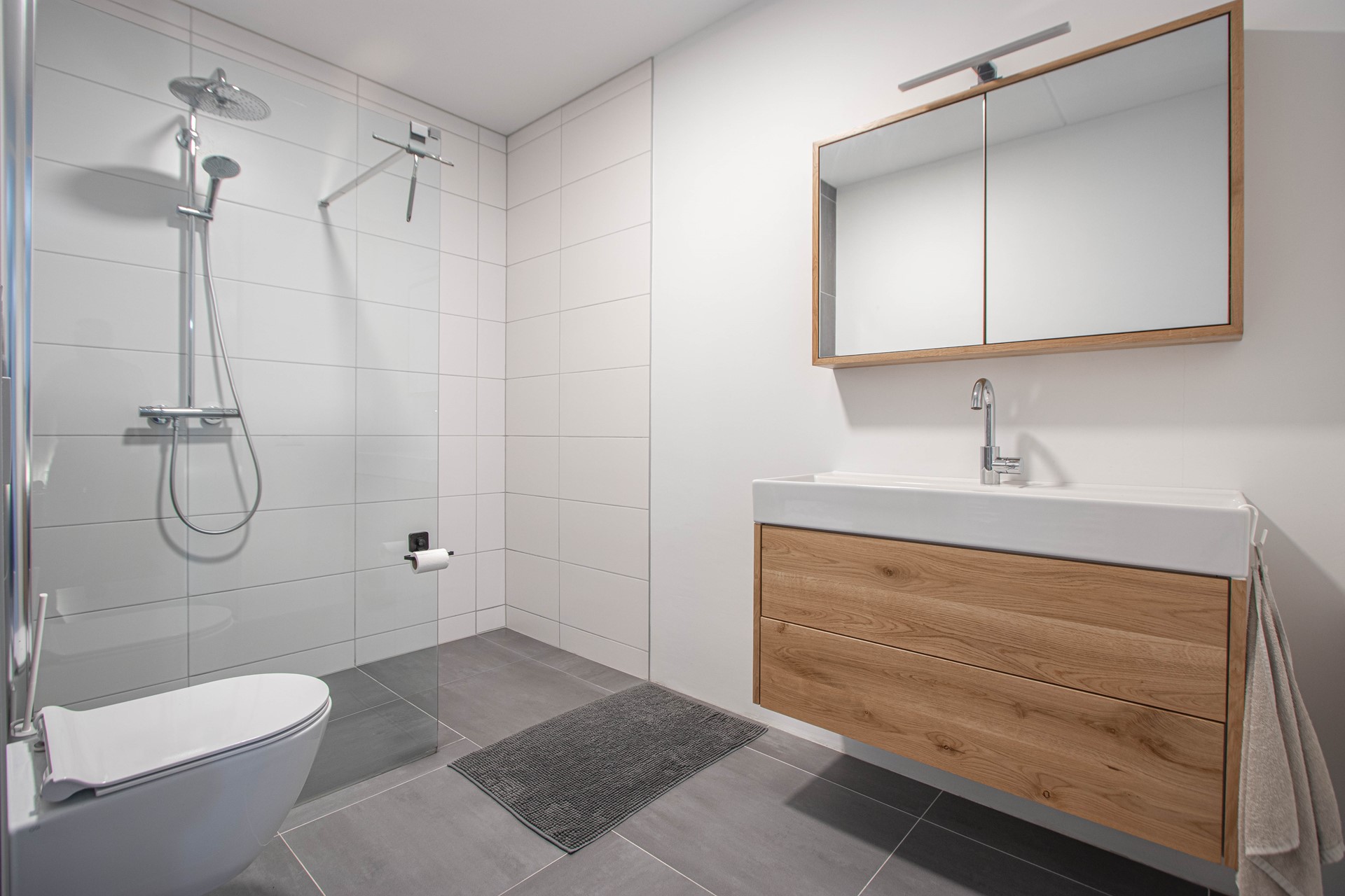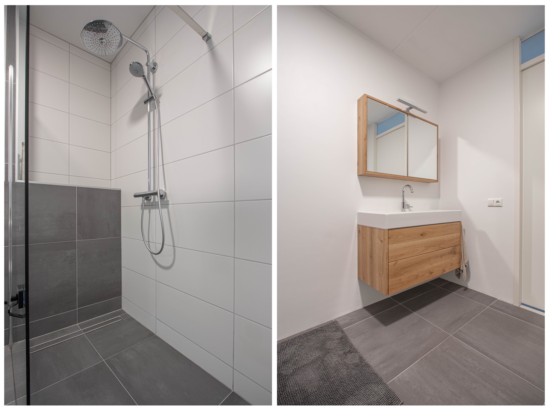Uitgekomen op de eerste verdieping treft men aan de overloop een 2e badkamer met inloopdouche en vaste wastafel met spiegelwand en twee extra slaapvertrekken. Ideaal voor een gezin met kinderen of senioren die nog een logeer-/hobby ruimte extra nodig hebben. De verdieping is afgewerkt met vinylvloeren en eveneens strak gestukte wanden en plafonds.