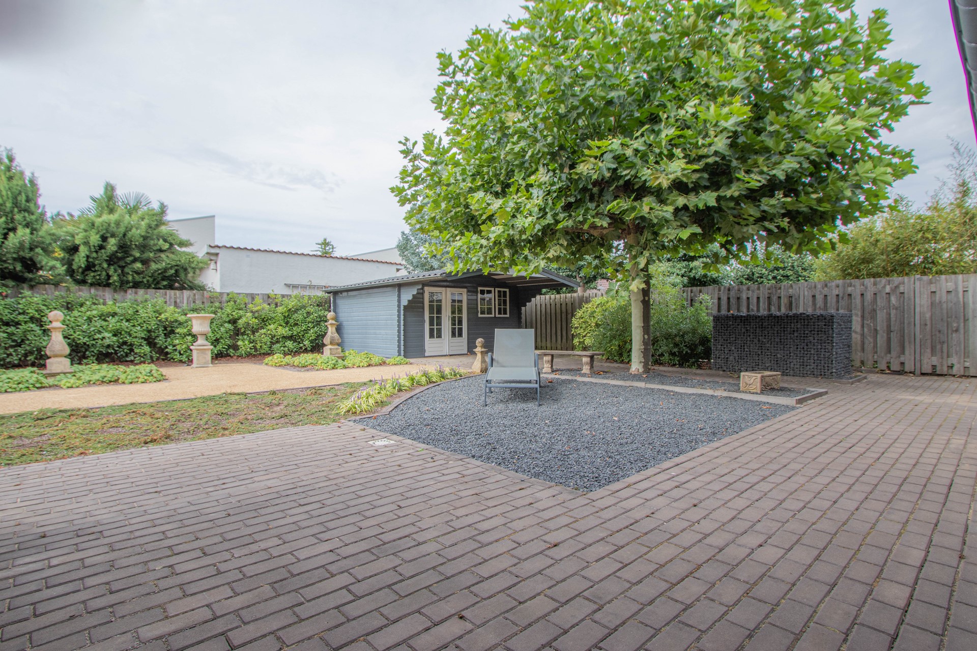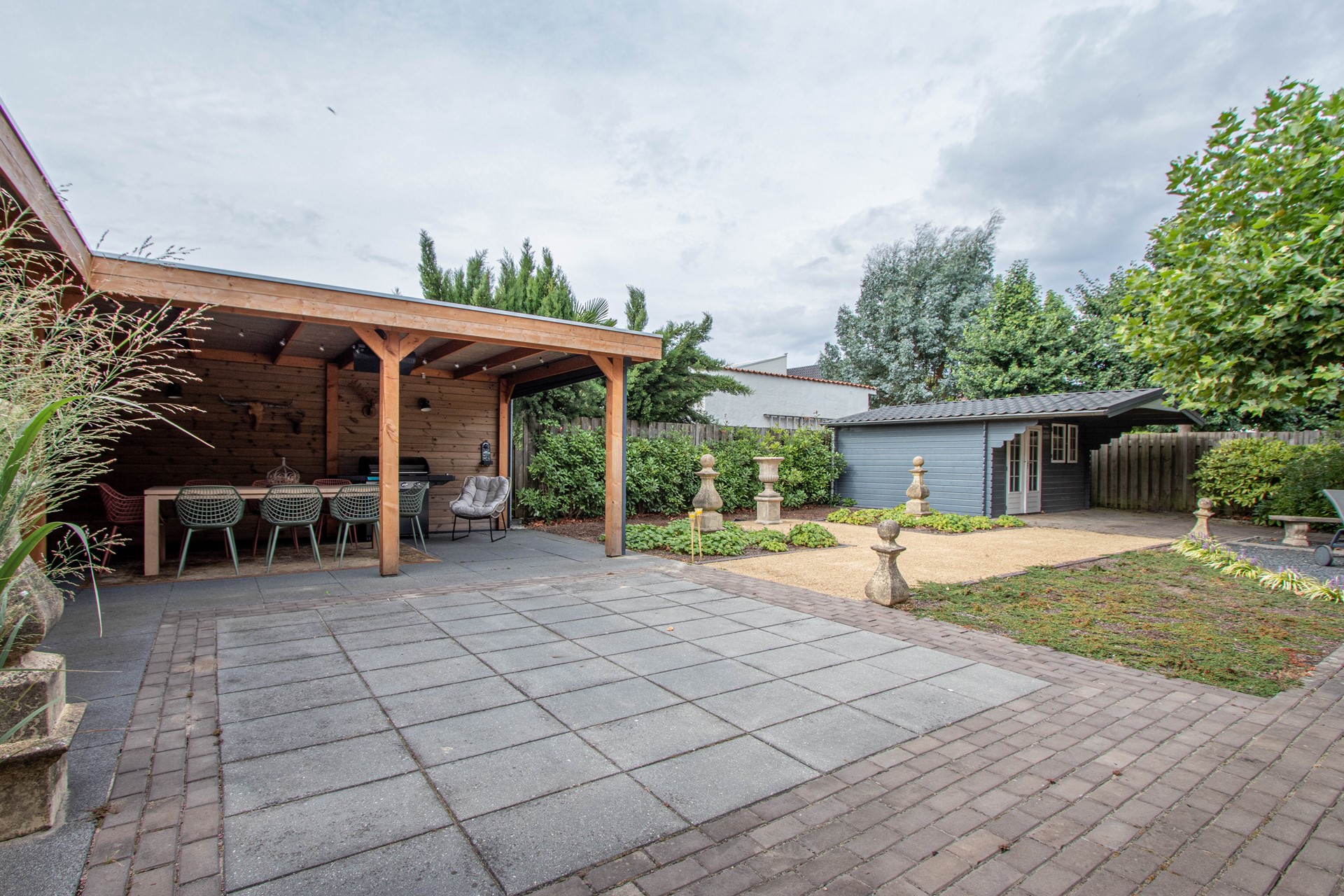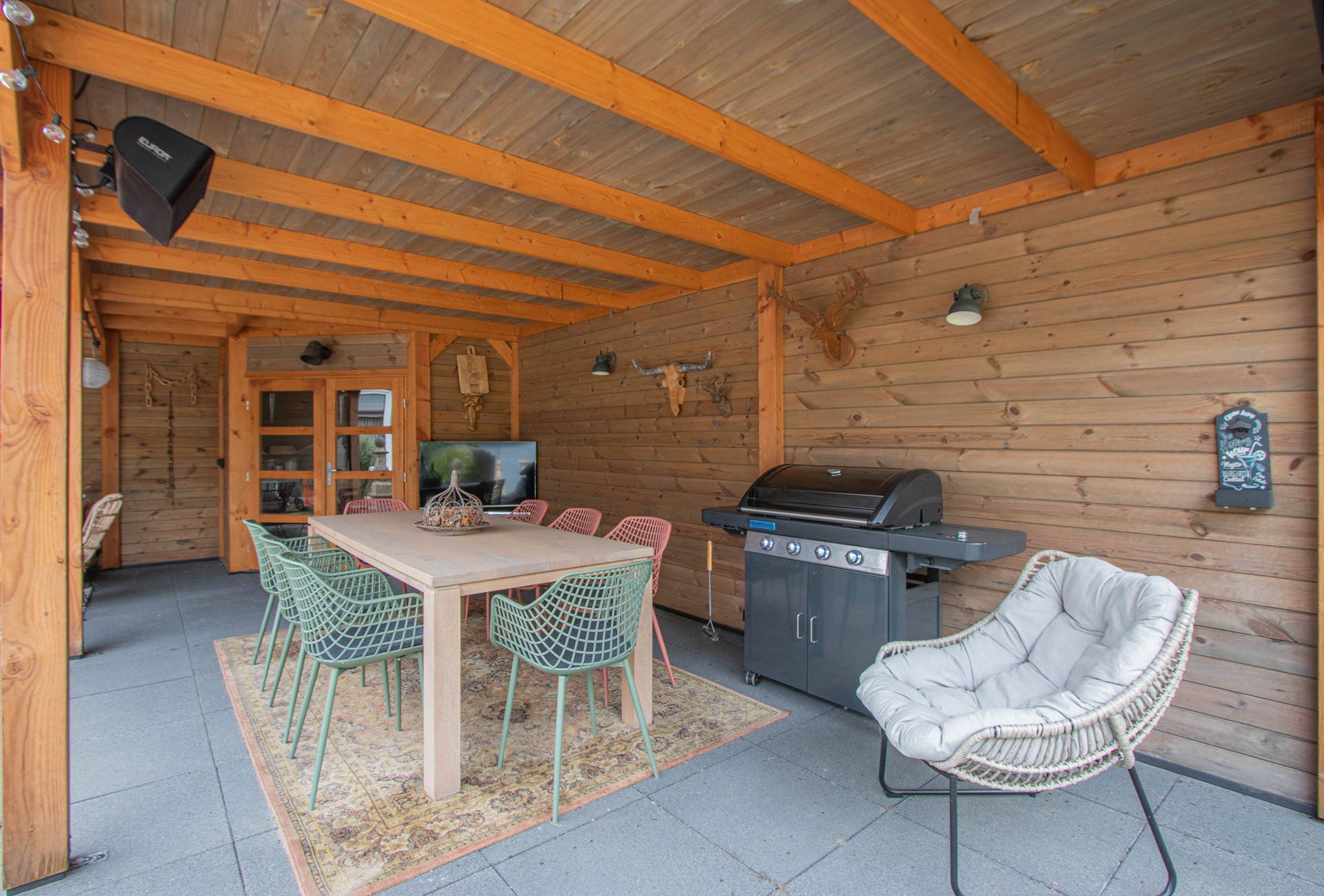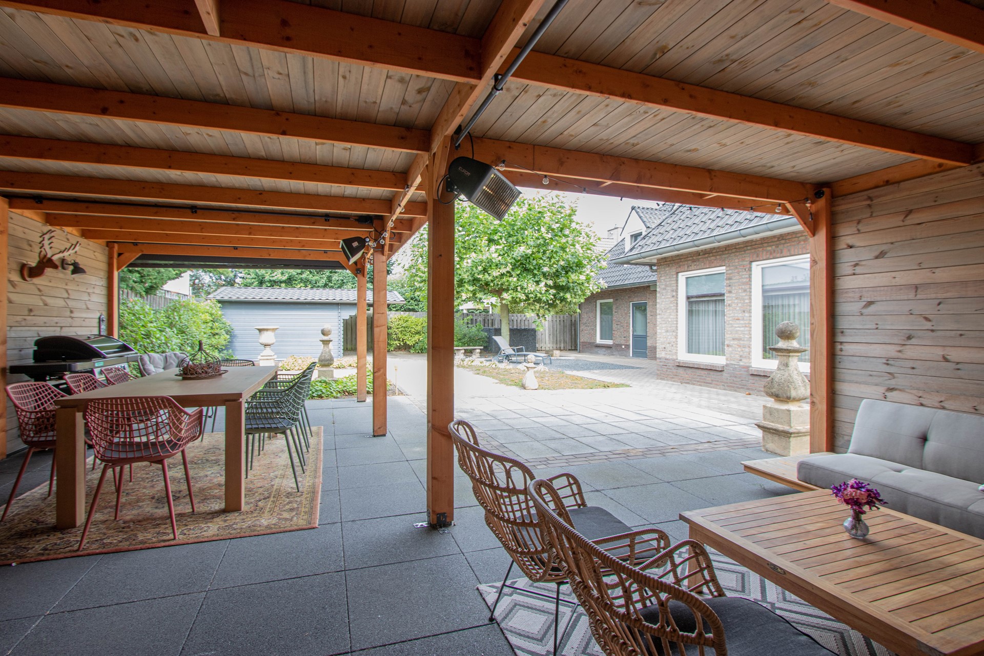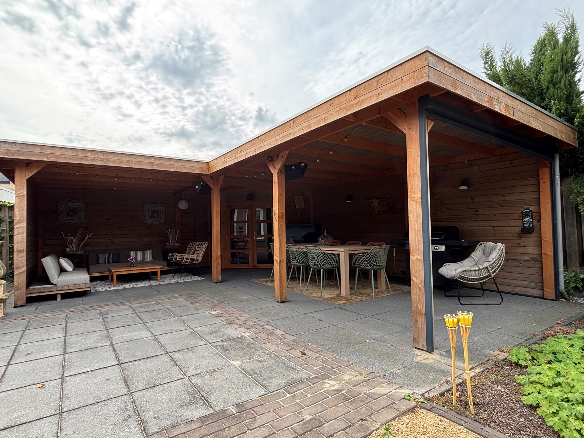 Eenmaal uitgekomen in de tuin kun je heerlijk genieten onder de grote L-vormige terrasoverkapping (ca. 50m²) van een heerlijk glas wijn of koud pilsje met familie en vrienden. Rechtsachter is nog een houten tuinhuis (ca. 15m²) met tegelvloer, waar je je tuingereedschappen, tuinaccessoires en fietsen kunt plaatsen. De tuin is onderhoudsvriendelijk aangelegd en van beide kanten te bereiken via afsluitbare poorten. Aan de voorzijde is ook nog plek om twee personenauto’s op de oprit te parkeren en aan de linkerzijde van de woning is plek voor de caravan of camper.