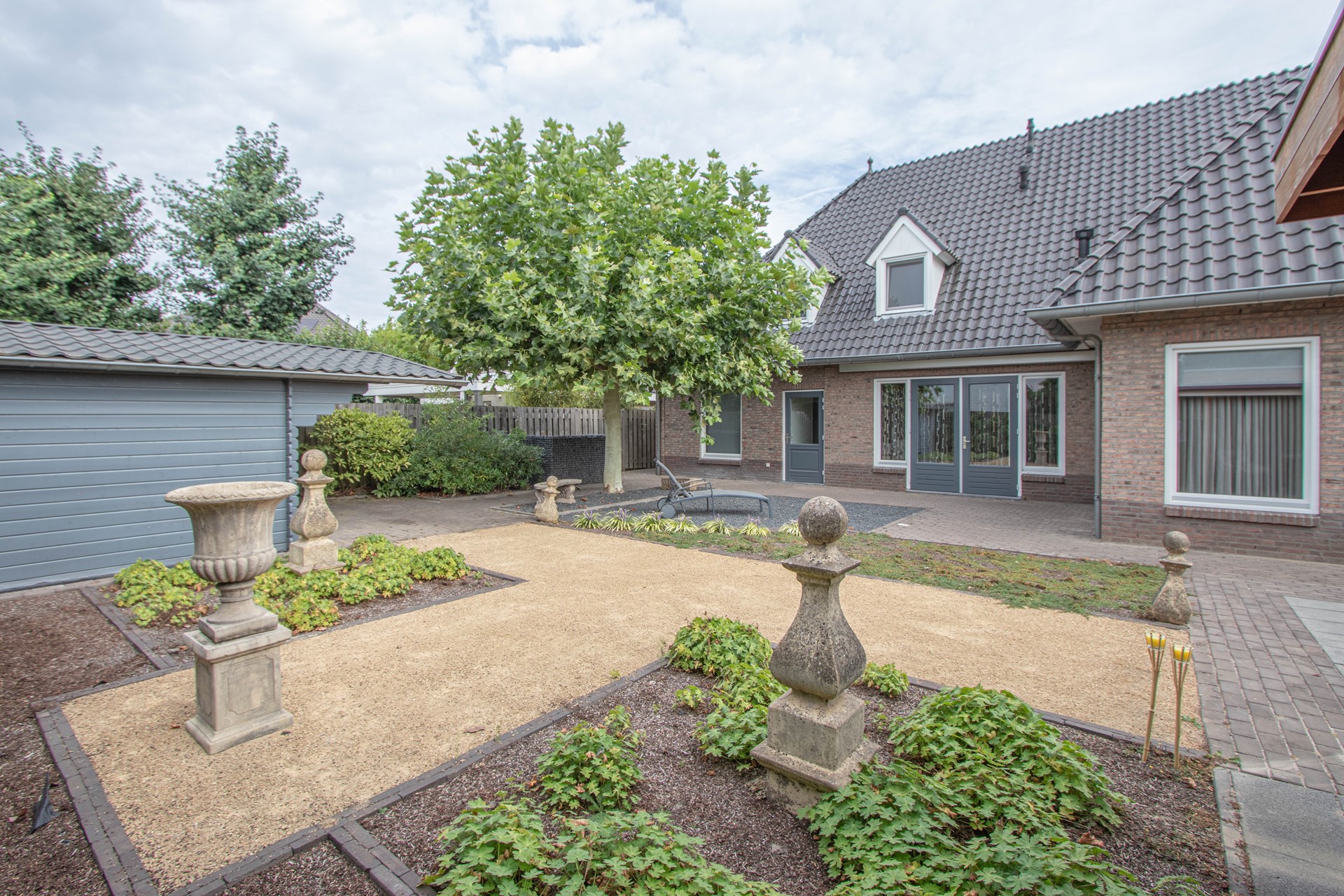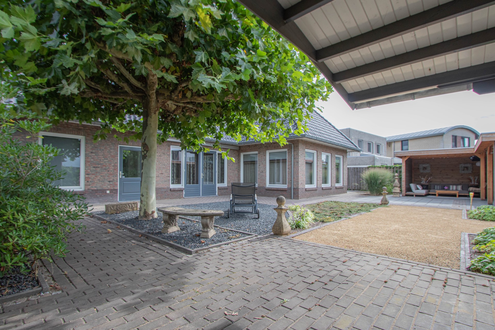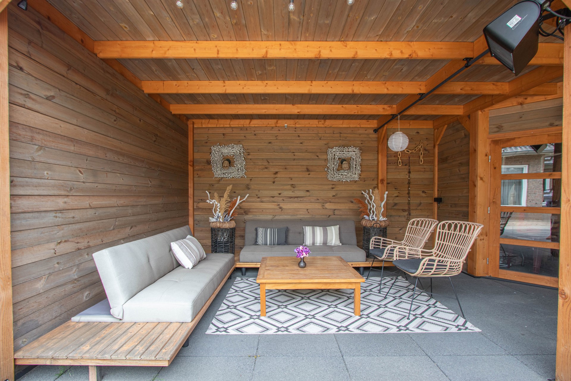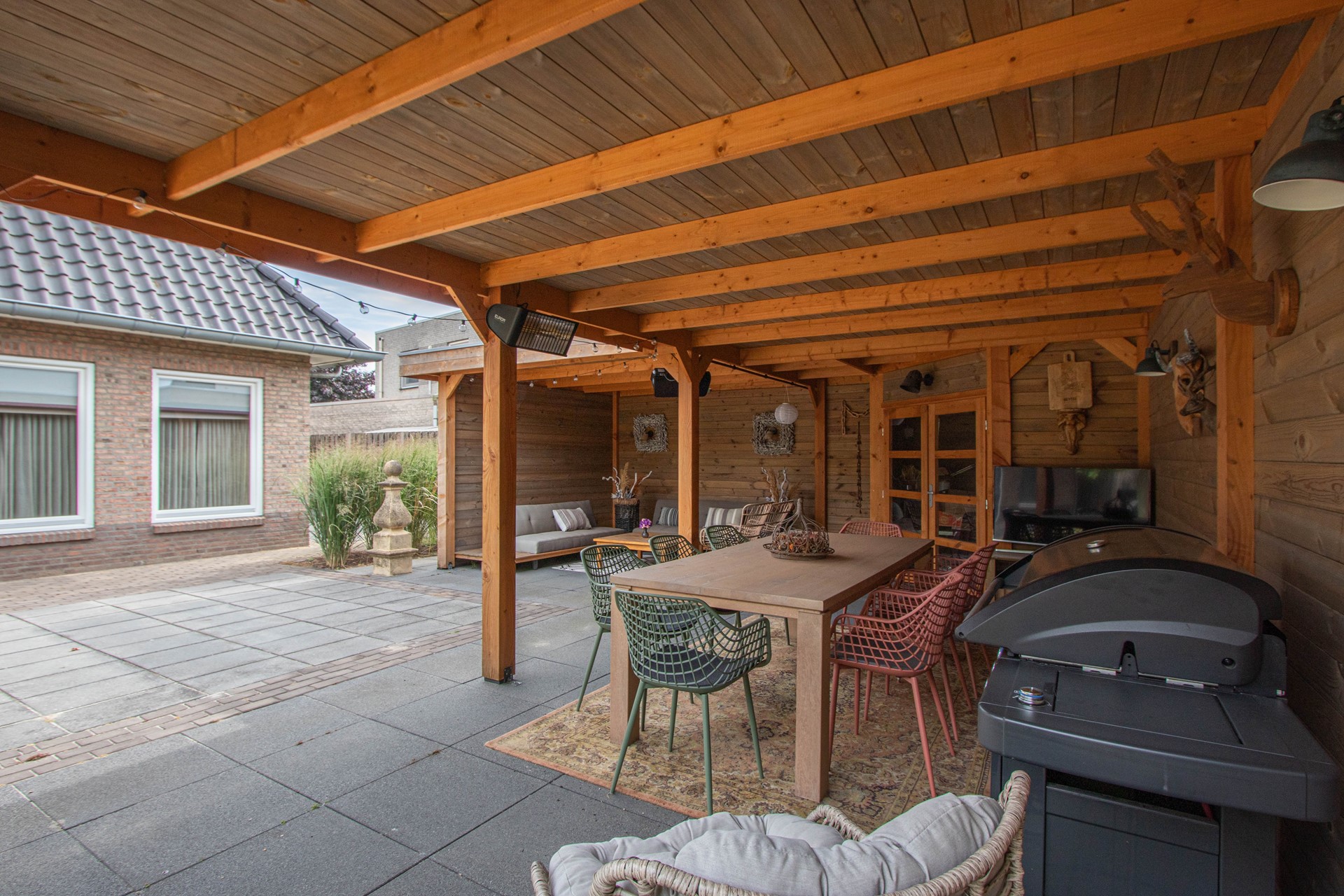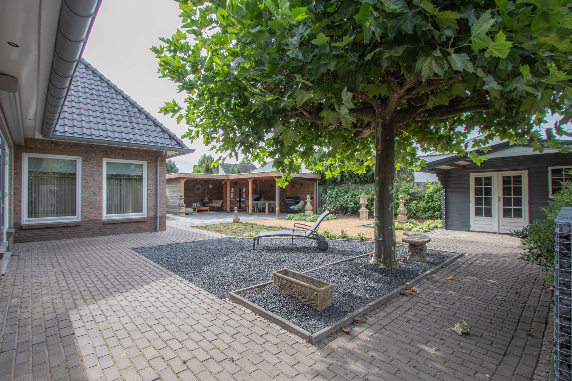 Eenmaal uitgekomen in de tuin kun je heerlijk genieten onder de grote L-vormige terrasoverkapping (ca. 50m²) van een heerlijk glas wijn of koud pilsje met familie en vrienden. Rechtsachter is nog een houten tuinhuis (ca. 15m²) met tegelvloer, waar je je tuingereedschappen, tuinaccessoires en fietsen kunt plaatsen. De tuin is onderhoudsvriendelijk aangelegd en van beide kanten te bereiken via afsluitbare poorten. Aan de voorzijde is ook nog plek om twee personenauto’s op de oprit te parkeren en aan de linkerzijde van de woning is plek voor de caravan of camper.