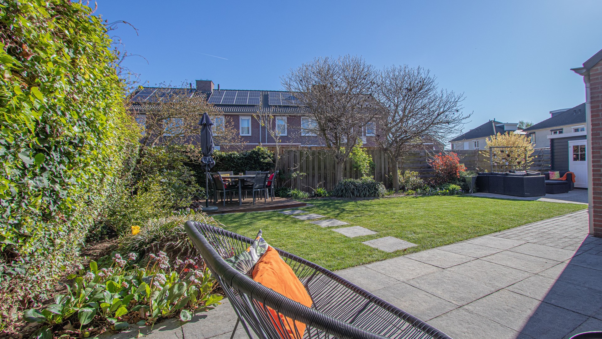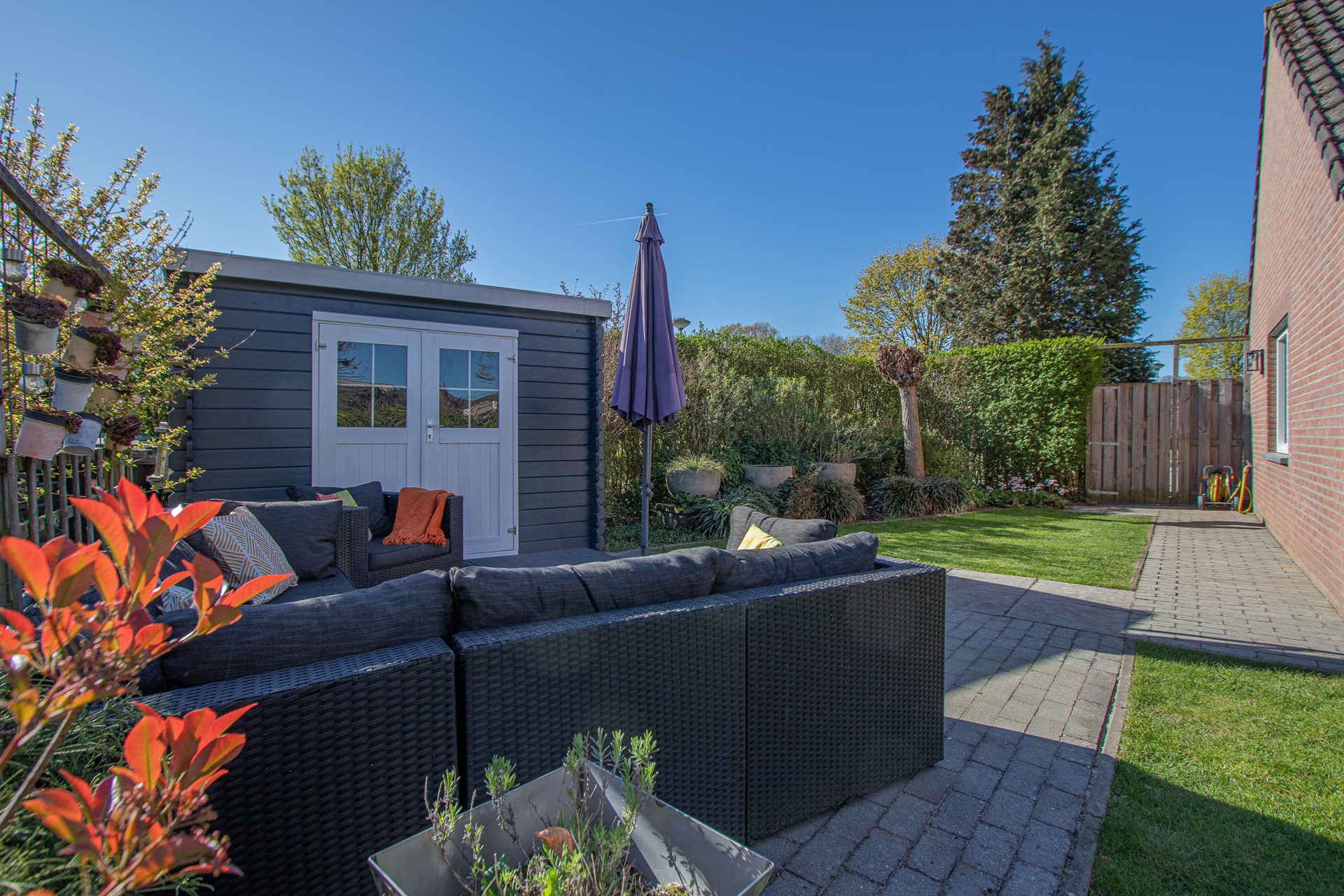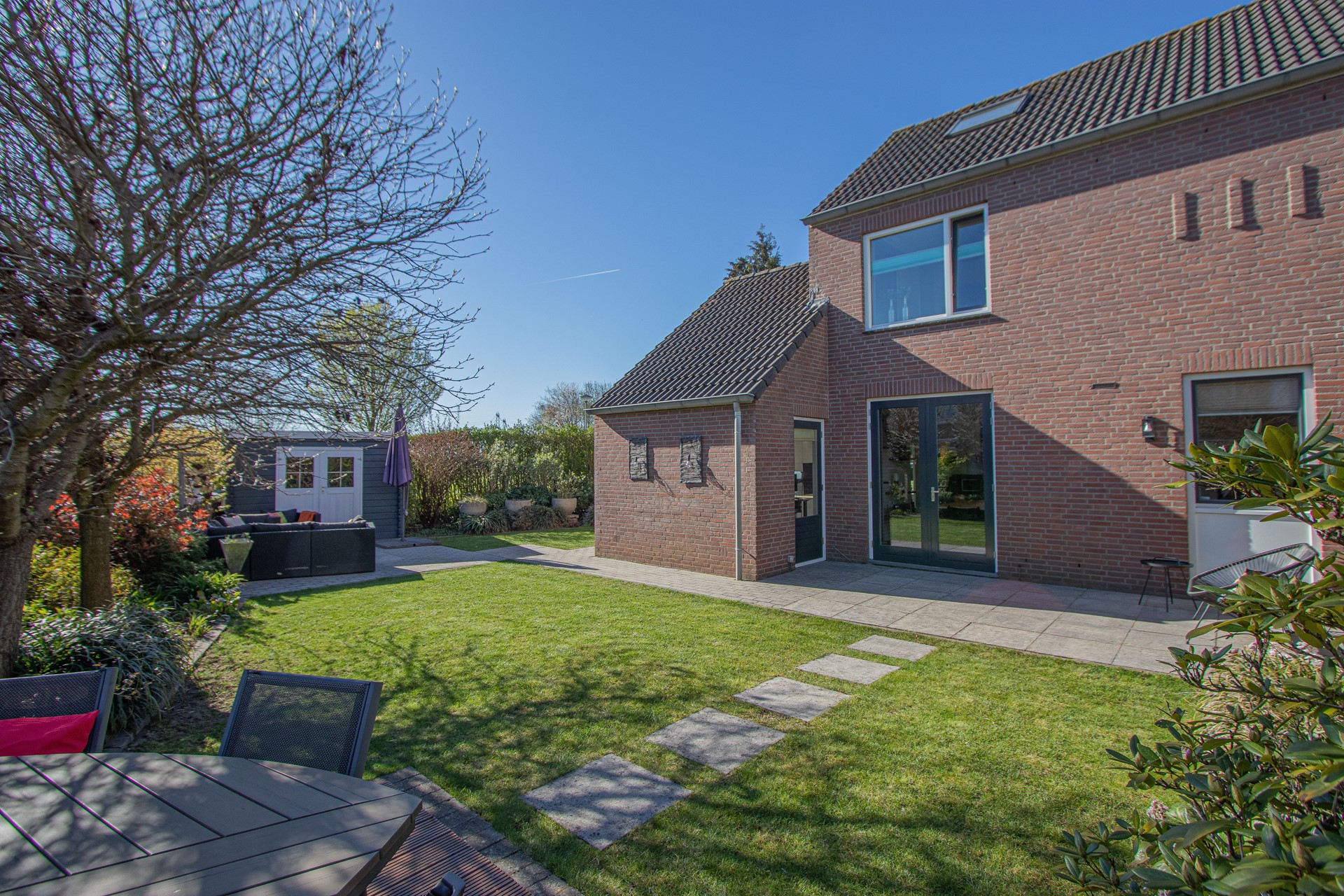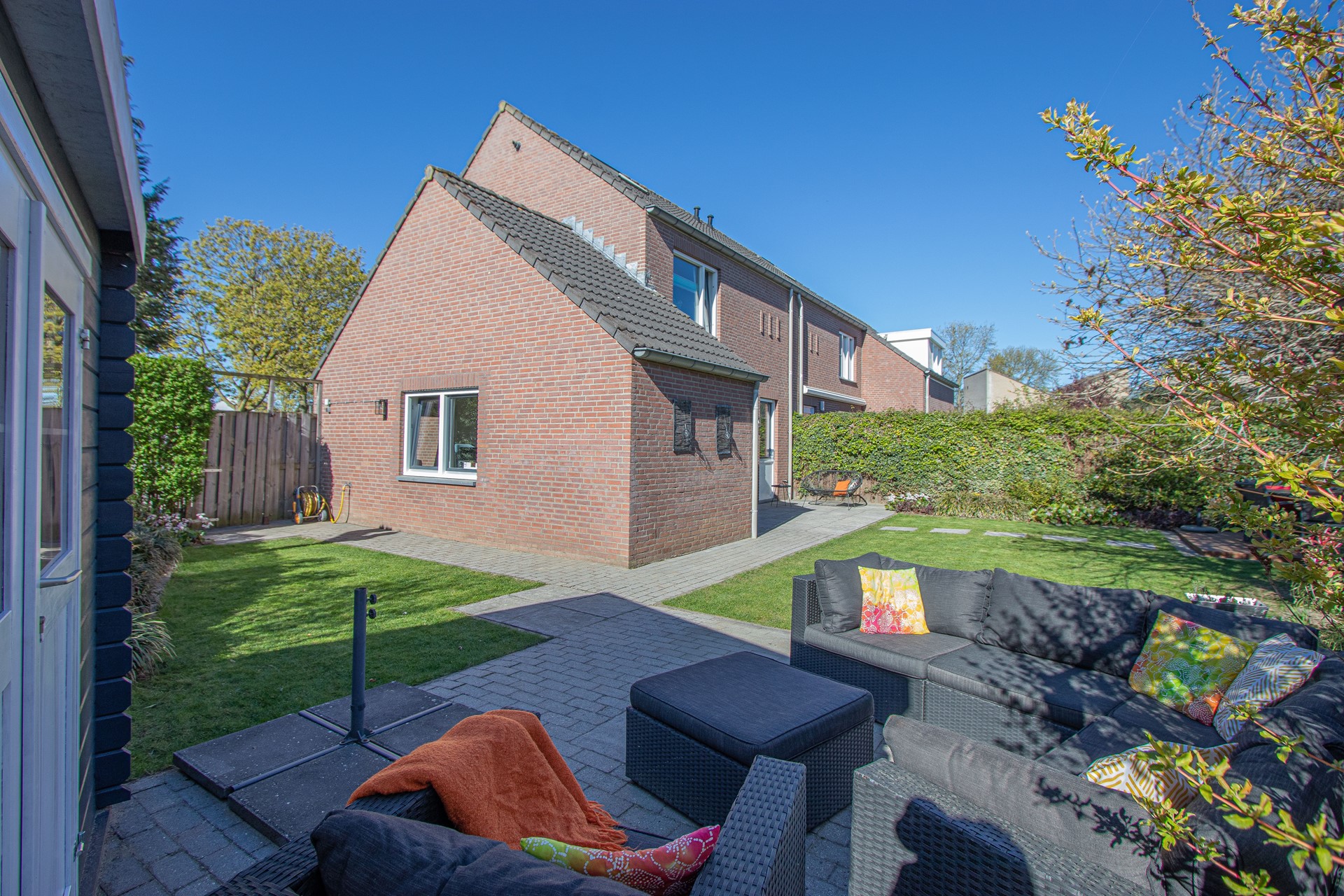 Geheel omsloten - keurig onderhoud tuin in L-vorm met graszode, diverse aanplant, zonneterras, houten tuinhuis voor opslag en eigen achterom. Brede oprit voor 2 auto's alsook verzorgd aangelegde voortuin gelegen aan rustig pleintje.