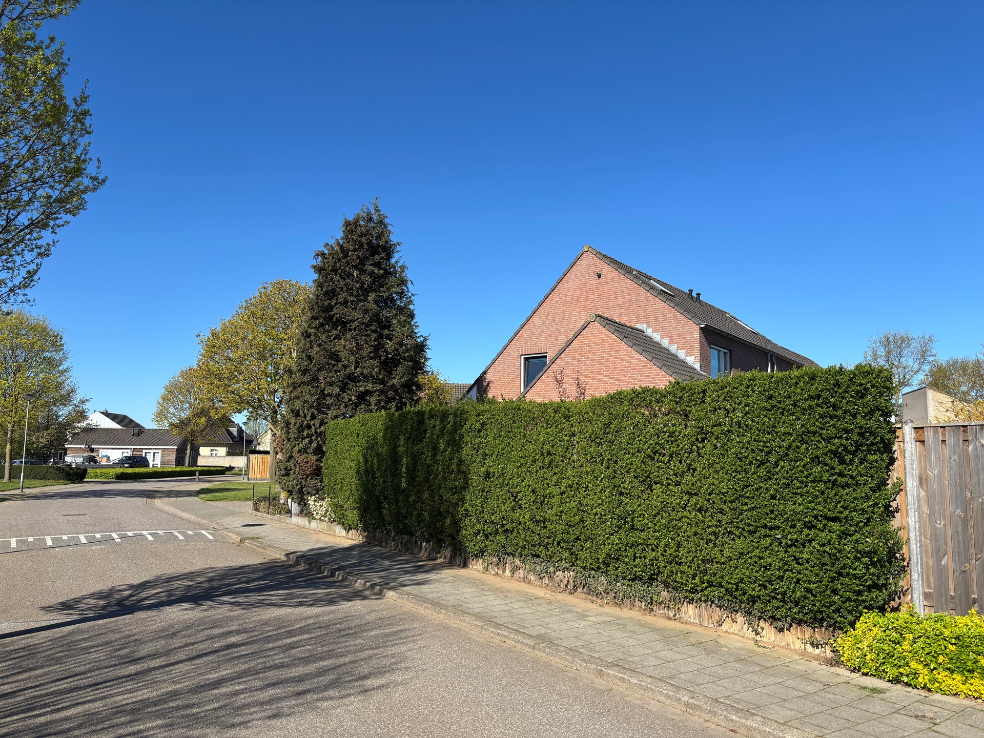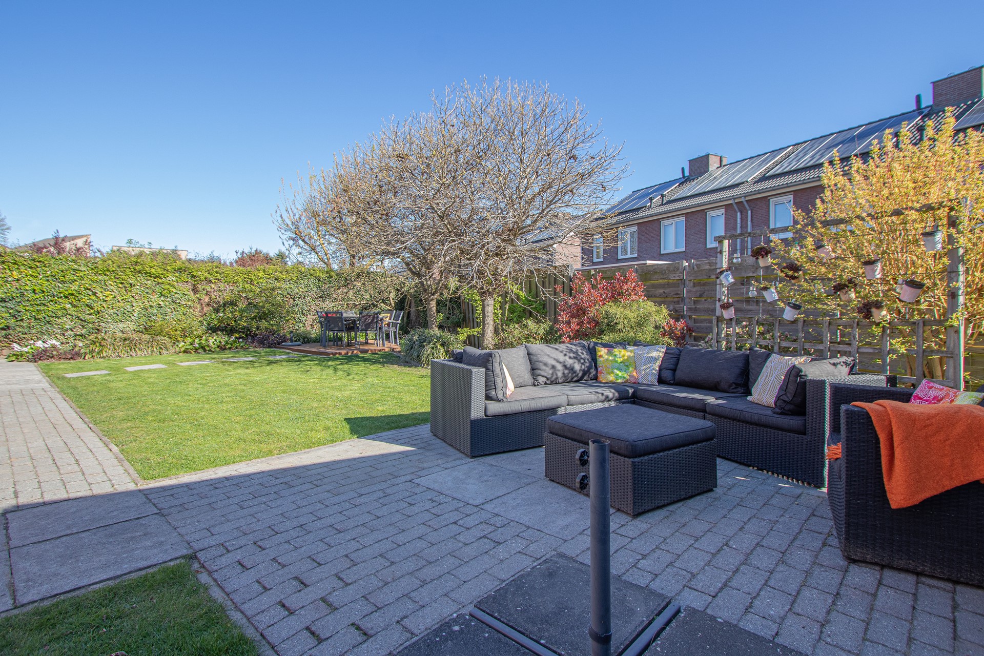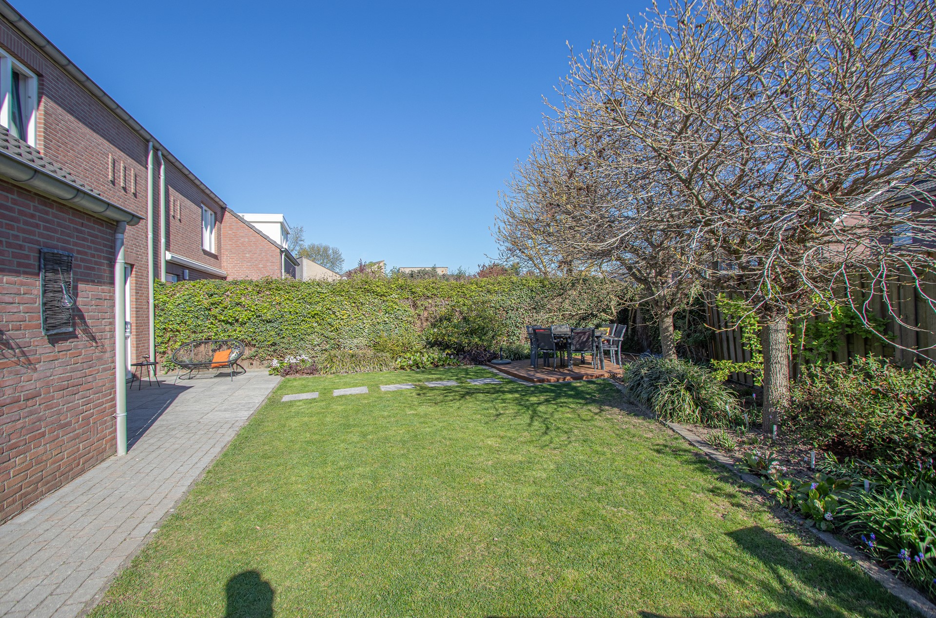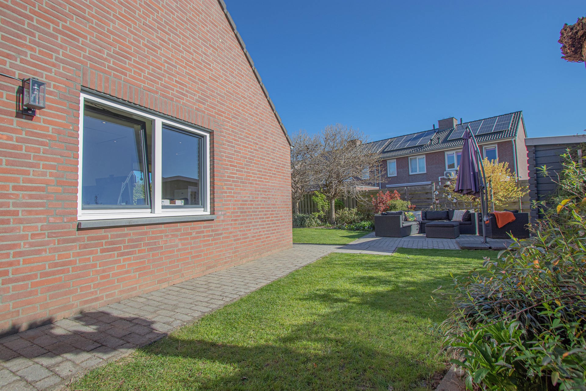 Geheel omsloten - keurig onderhoud tuin in L-vorm met graszode, diverse aanplant, zonneterras, houten tuinhuis voor opslag en eigen achterom. Brede oprit voor 2 auto's alsook verzorgd aangelegde voortuin gelegen aan rustig pleintje.