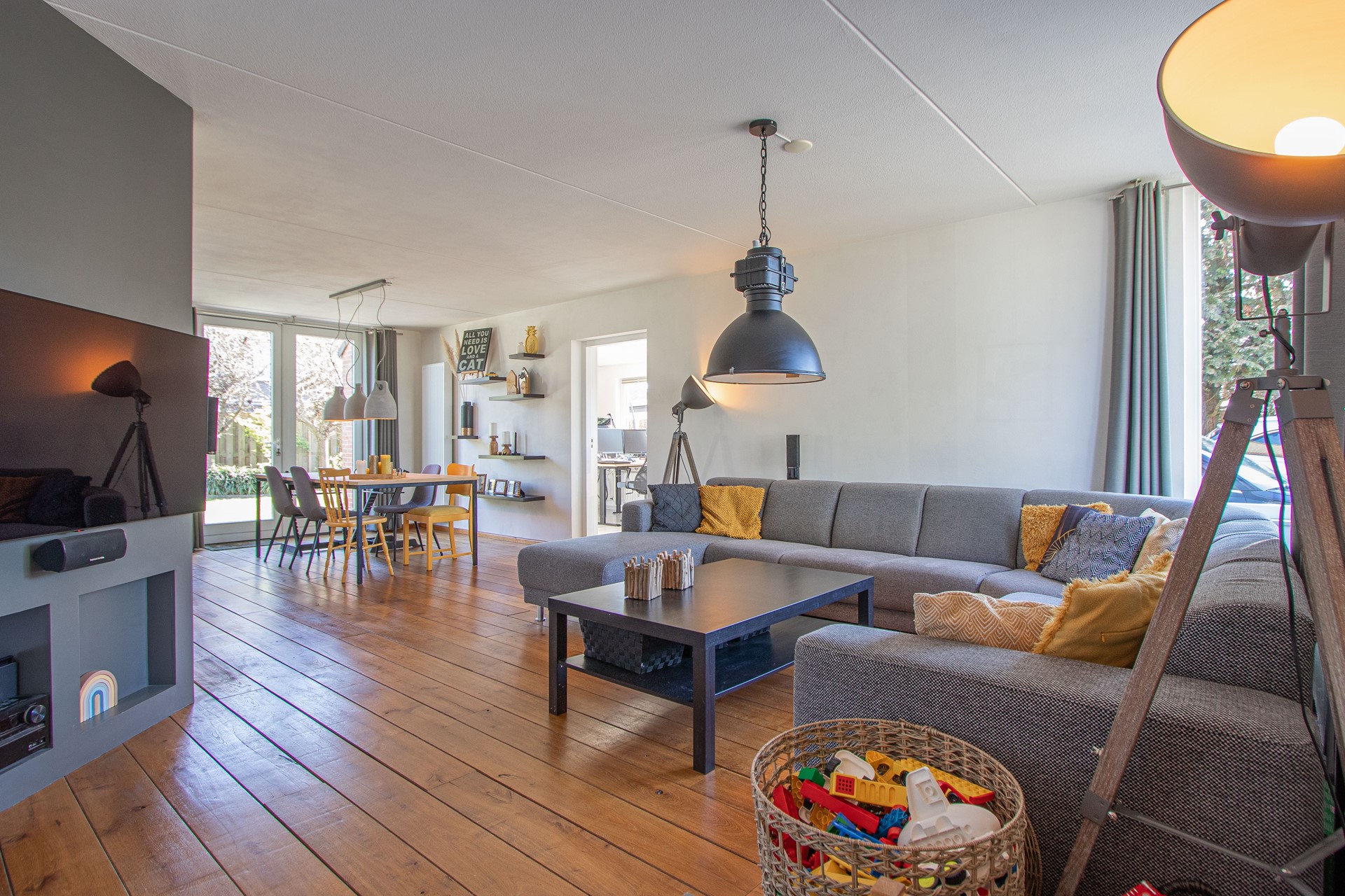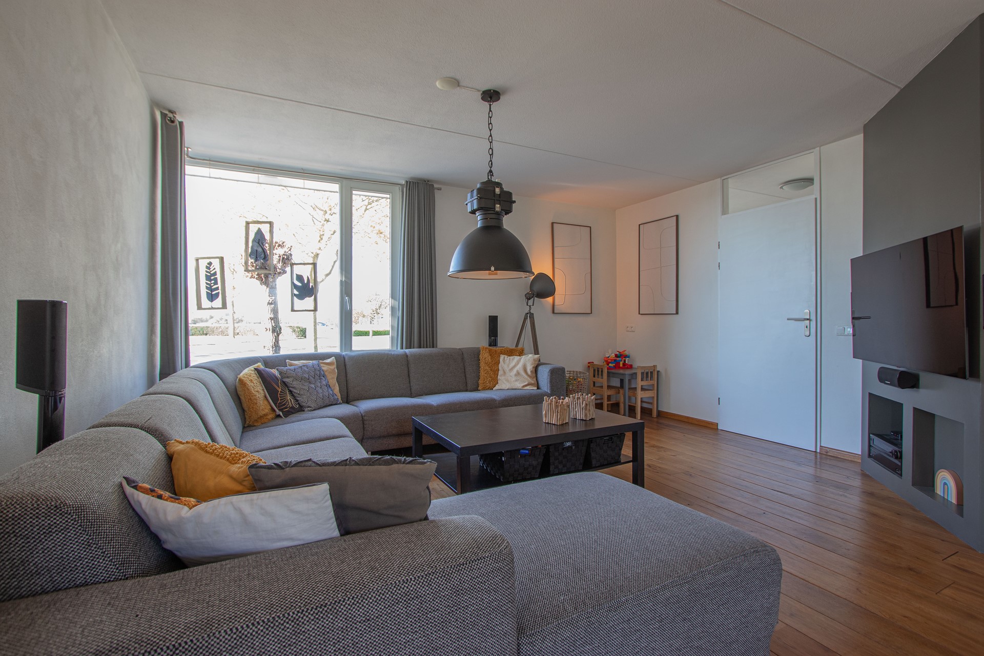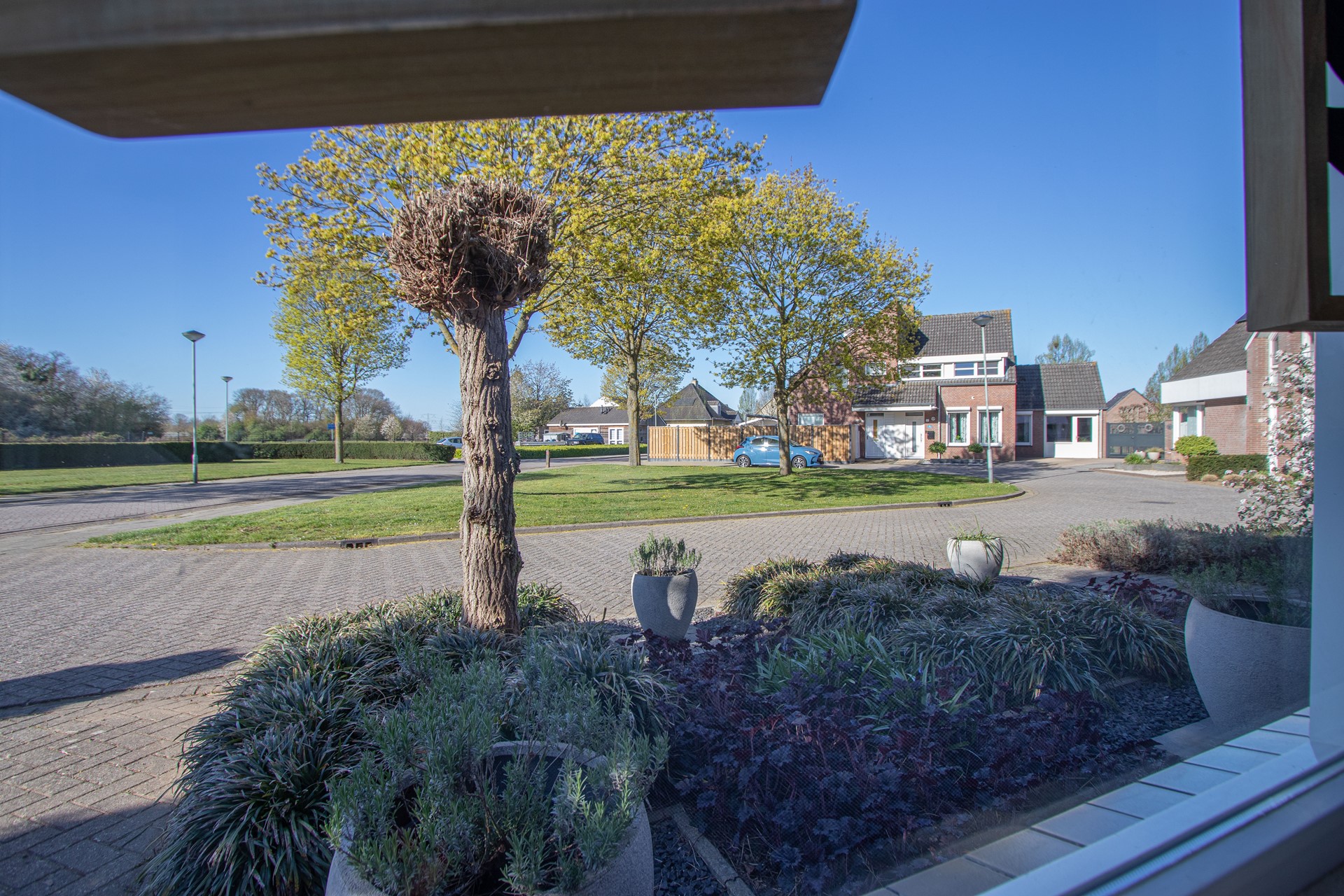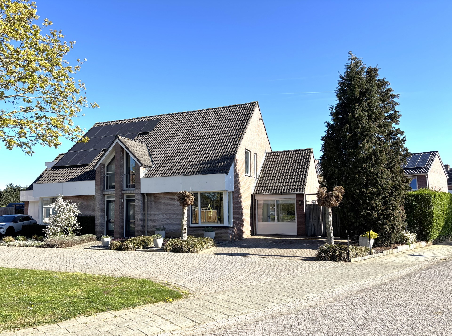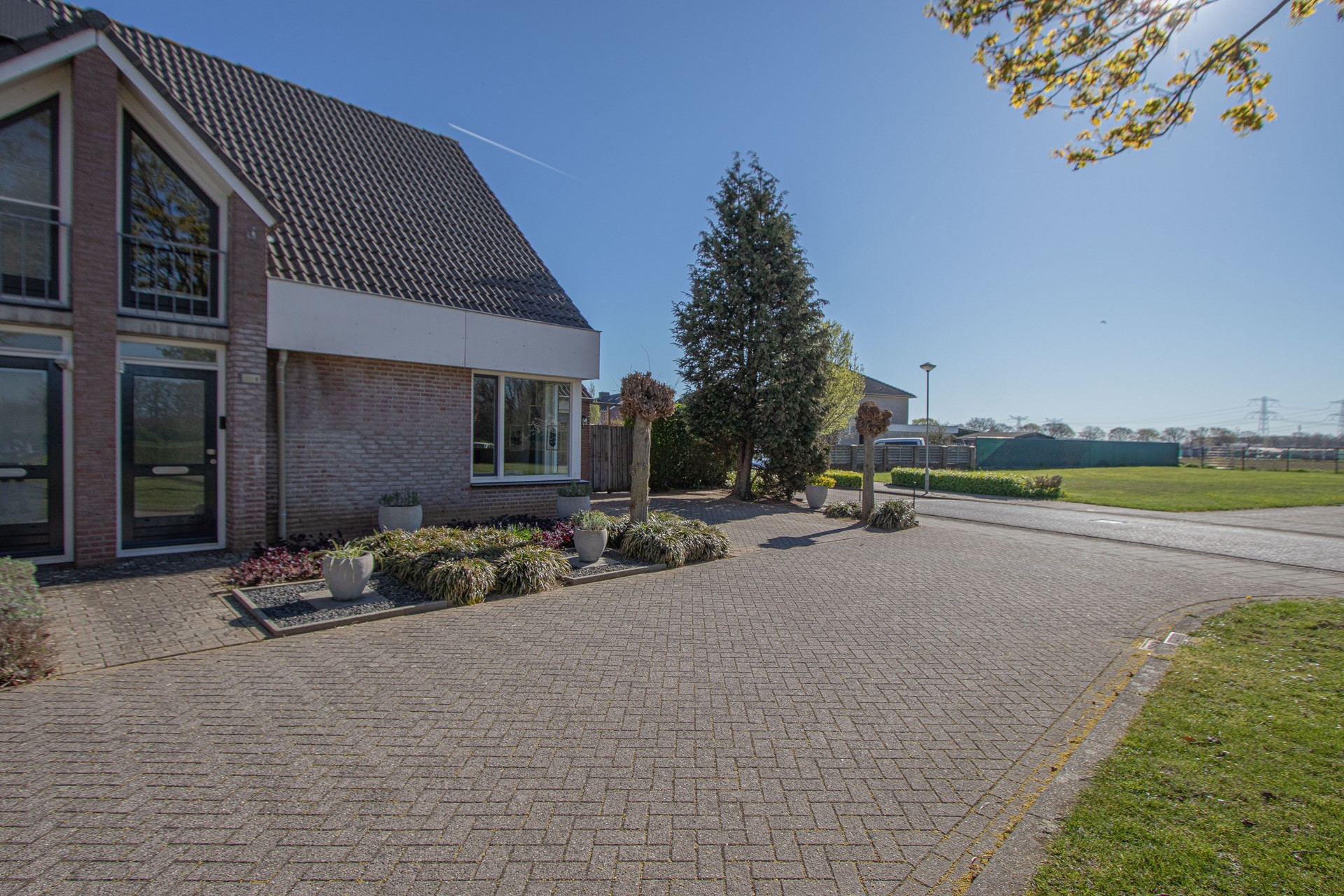 Geheel omsloten - keurig onderhoud tuin in L-vorm met graszode, diverse aanplant, zonneterras, houten tuinhuis voor opslag en eigen achterom. Brede oprit voor 2 auto's alsook verzorgd aangelegde voortuin gelegen aan rustig pleintje.