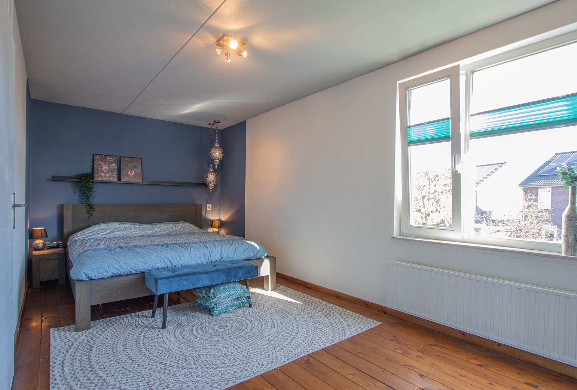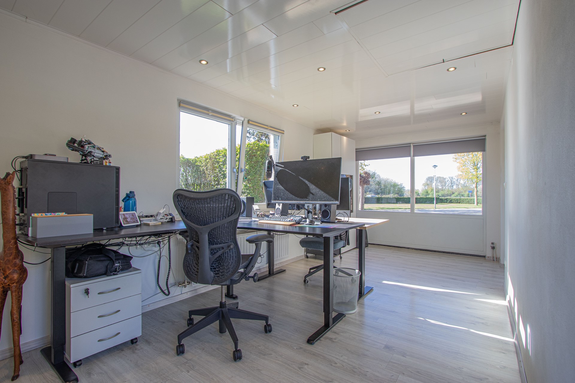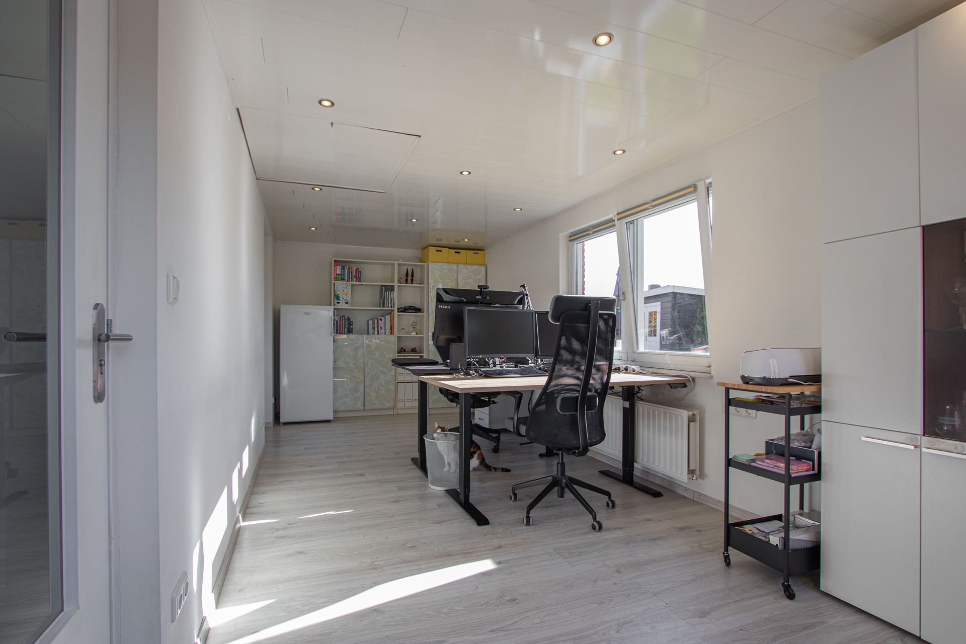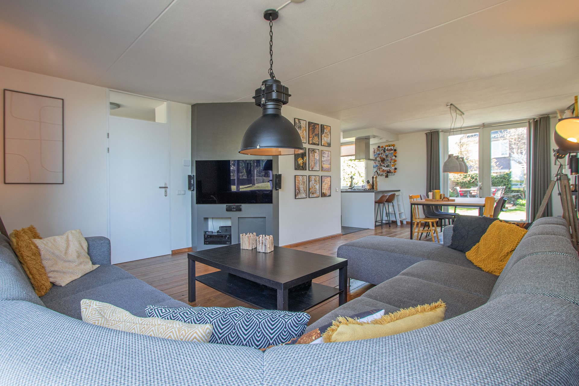 Geheel omsloten - keurig onderhoud tuin in L-vorm met graszode, diverse aanplant, zonneterras, houten tuinhuis voor opslag en eigen achterom. Brede oprit voor 2 auto's alsook verzorgd aangelegde voortuin gelegen aan rustig pleintje.