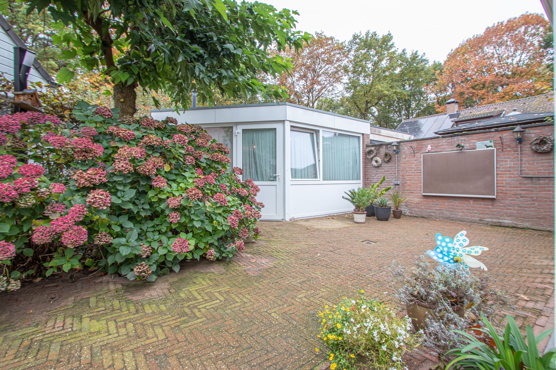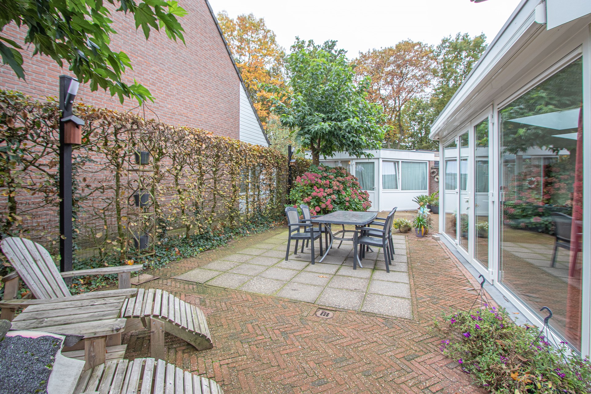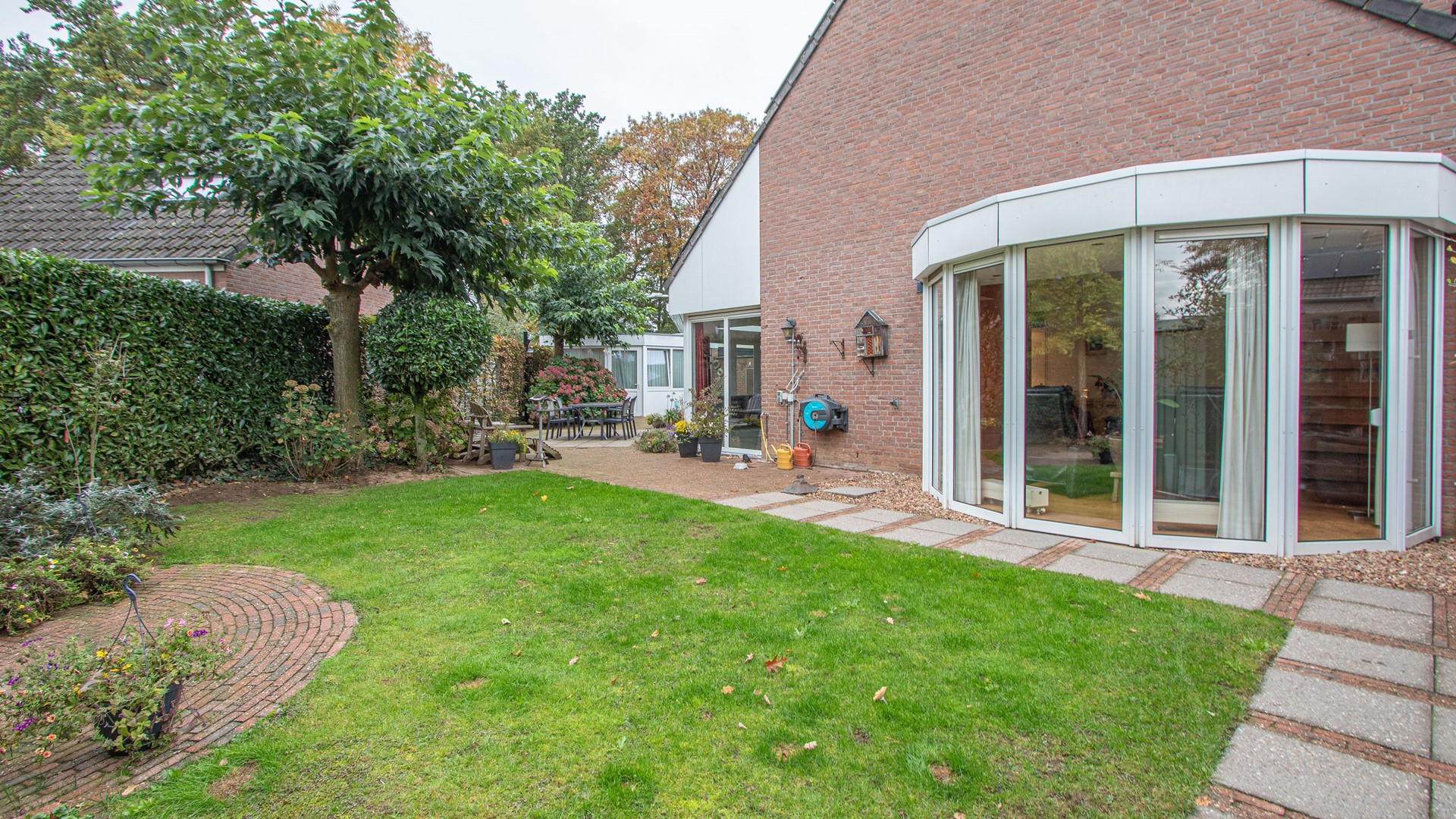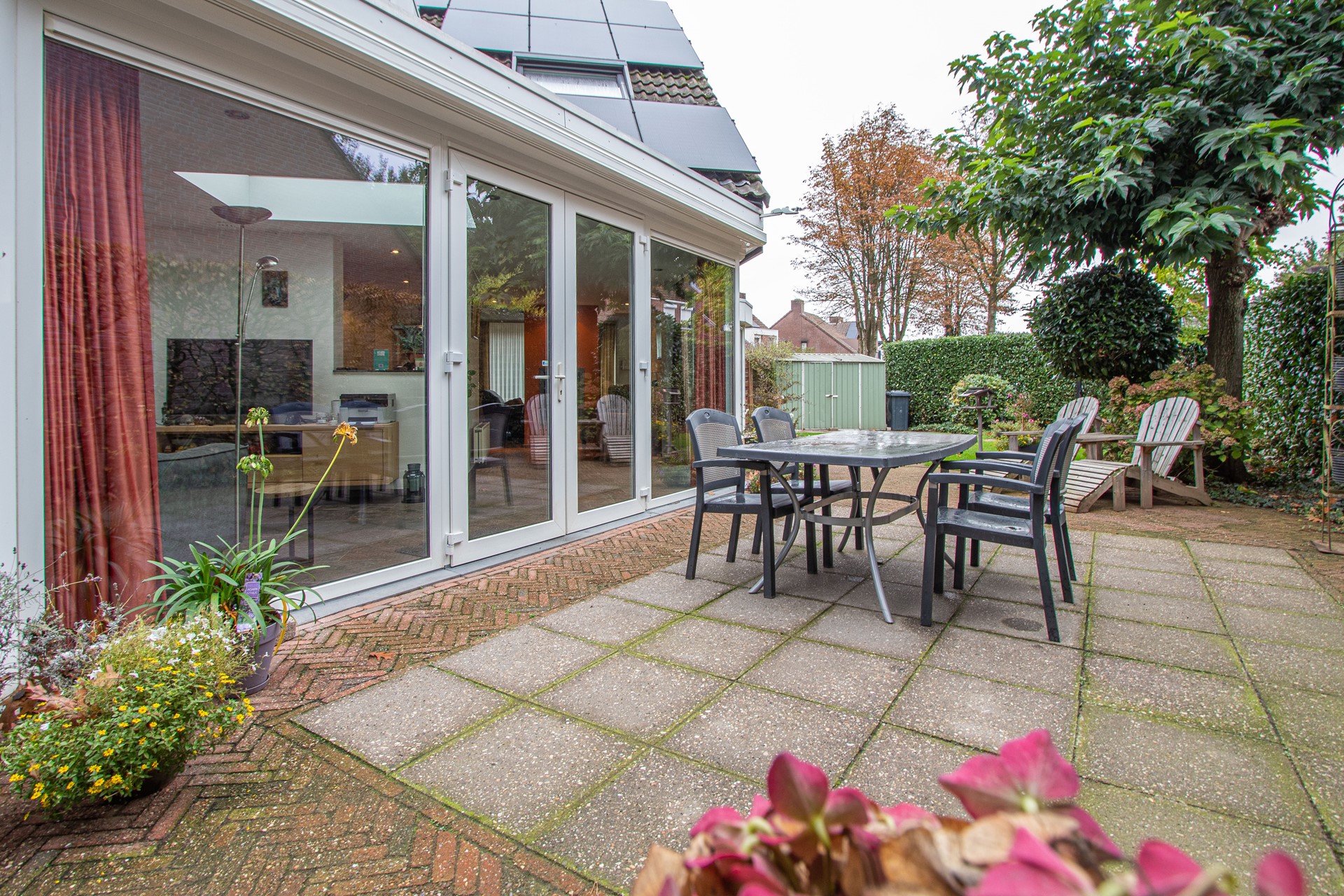Eenmaal buiten heb je een geheel omsloten – bovenal privacy biedende achtertuin met eigen achterom met borders, graszode en een tweetal terrassen waar je in de betere dagen heerlijk kunt genieten van al het natuurschoon. Dit alles ligt op loopafstand van de bossen waar je één bent met de natuur. De straat is rustig en hier komt enkel bestemmingsverkeer. De huidige bewoners hebben veel aandacht besteed qua verduurzaming waarbij er inmiddels muur, vloer en dakisolatie aanwezig zijn – 39 zonnepanelen – warmtepomp – zonneboiler – airco waarbij de stookkosten aantrekkelijk laag zijn.
