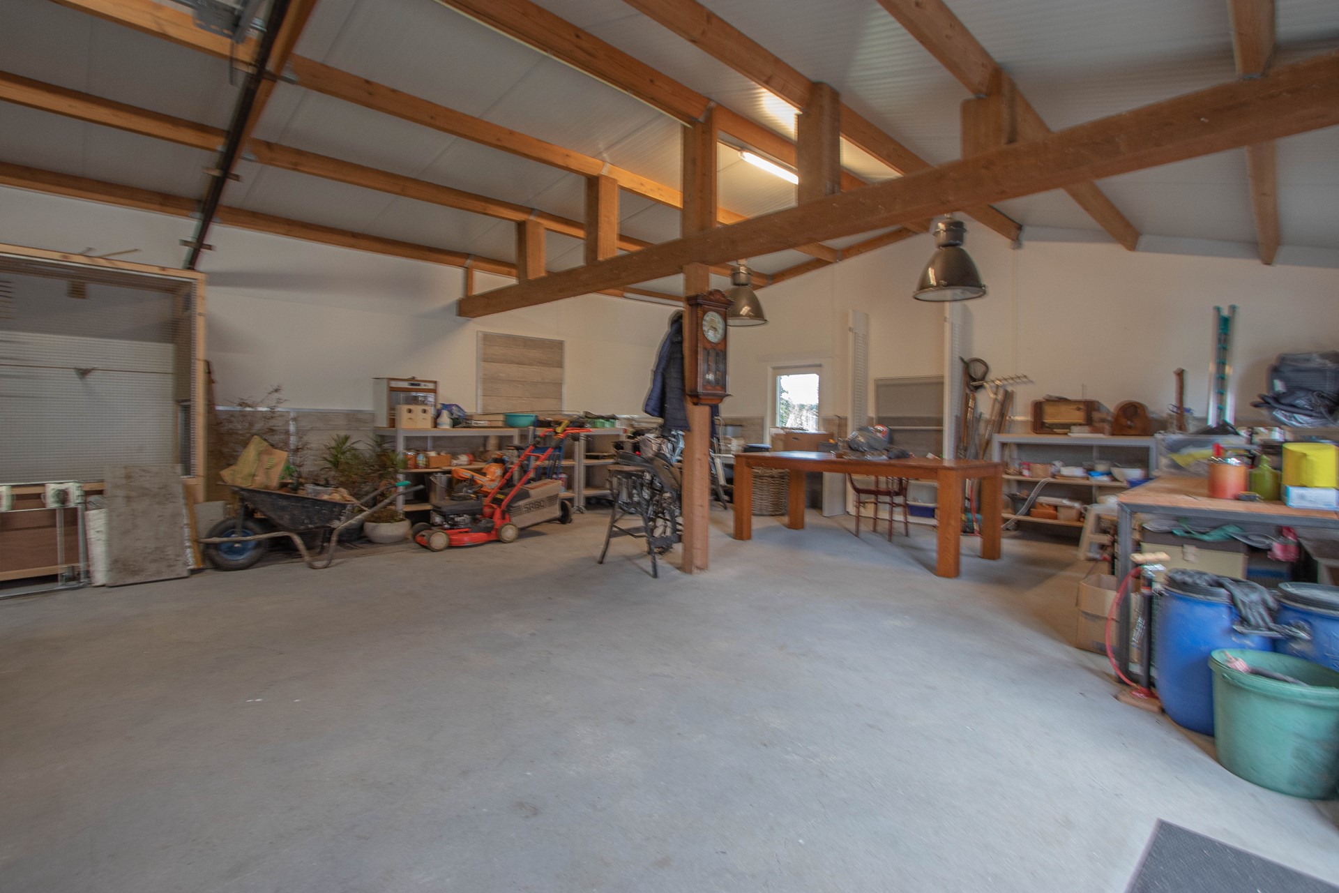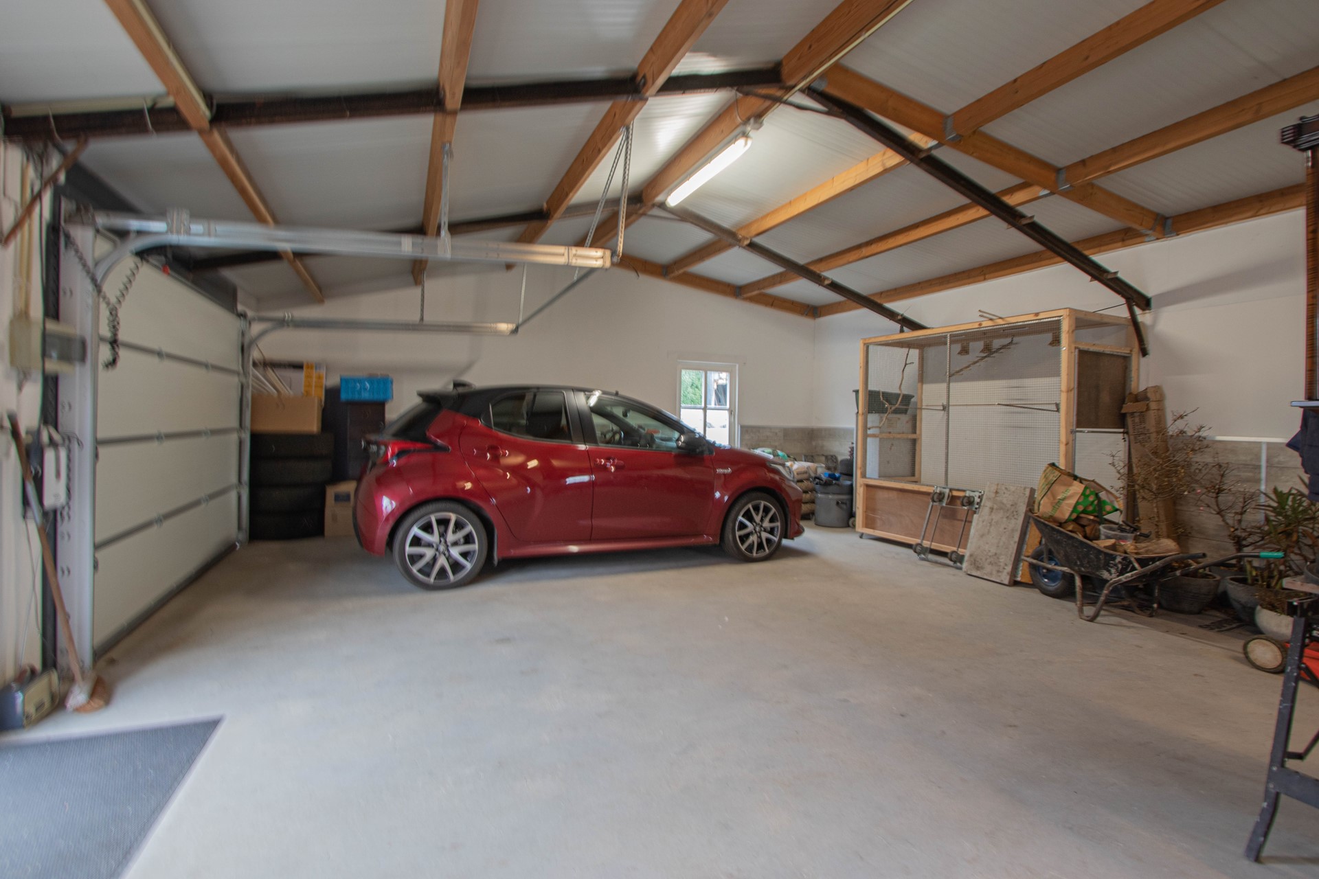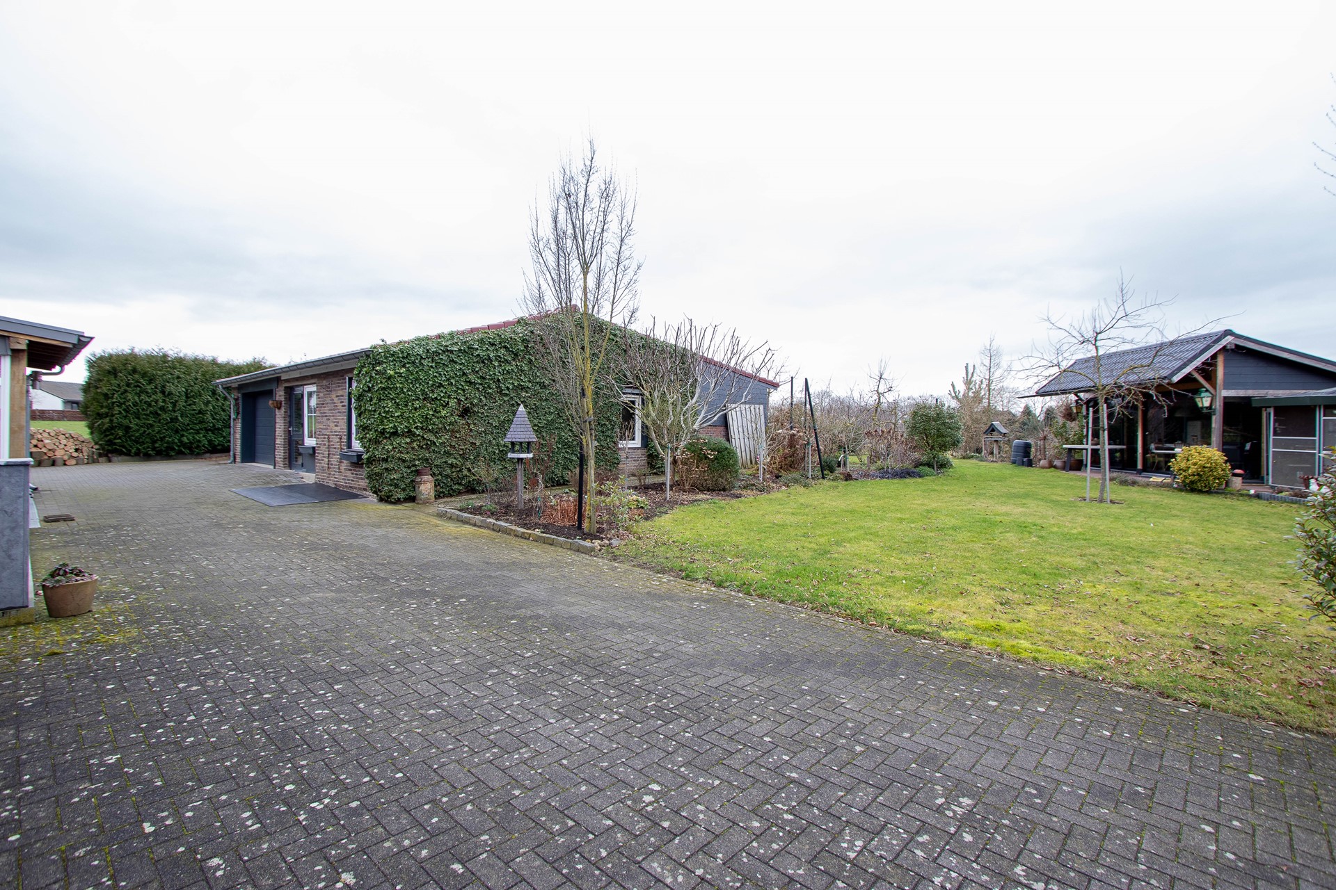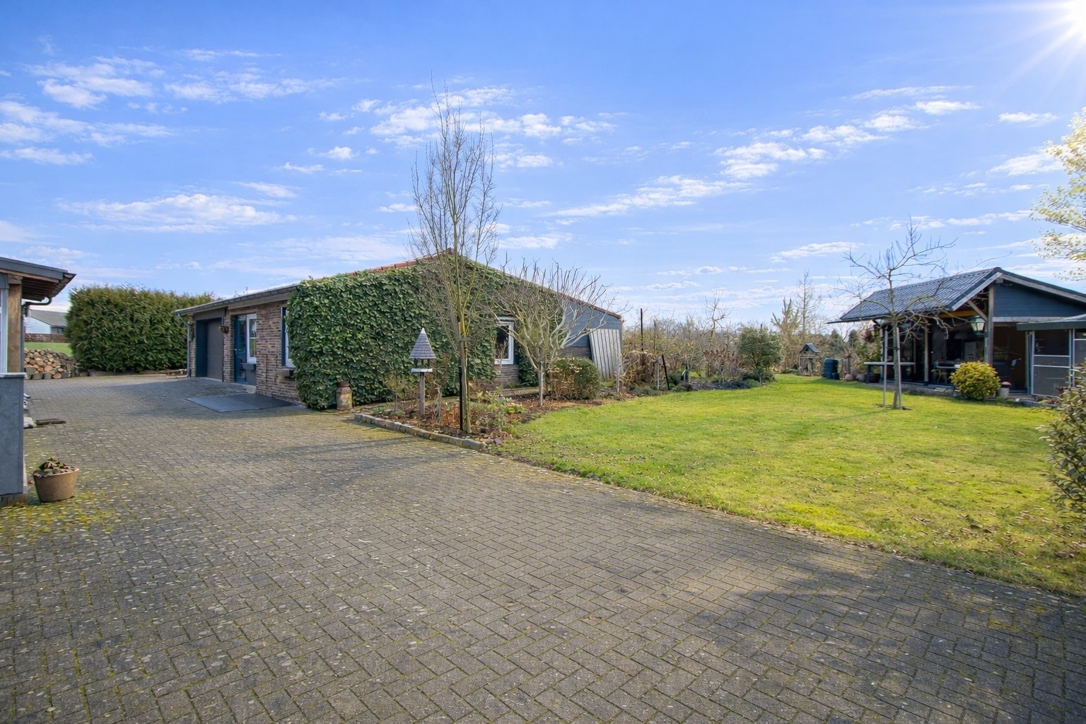 Parkachtige tuin met luxe tuinkamer, volières, kippenren, groentetuin, 3 paardenboxen, vrijstaande garage, schuur en riante carport met via twee kanten toegang tot de tuin.