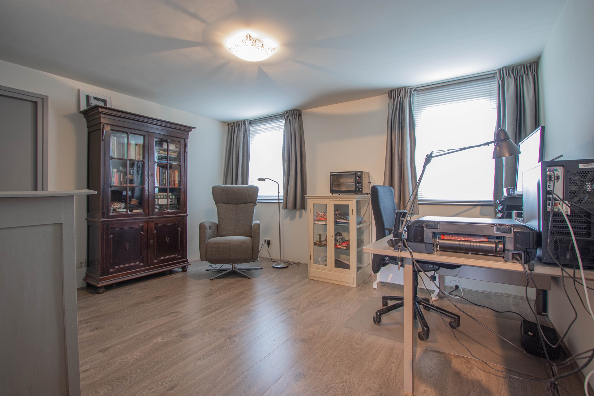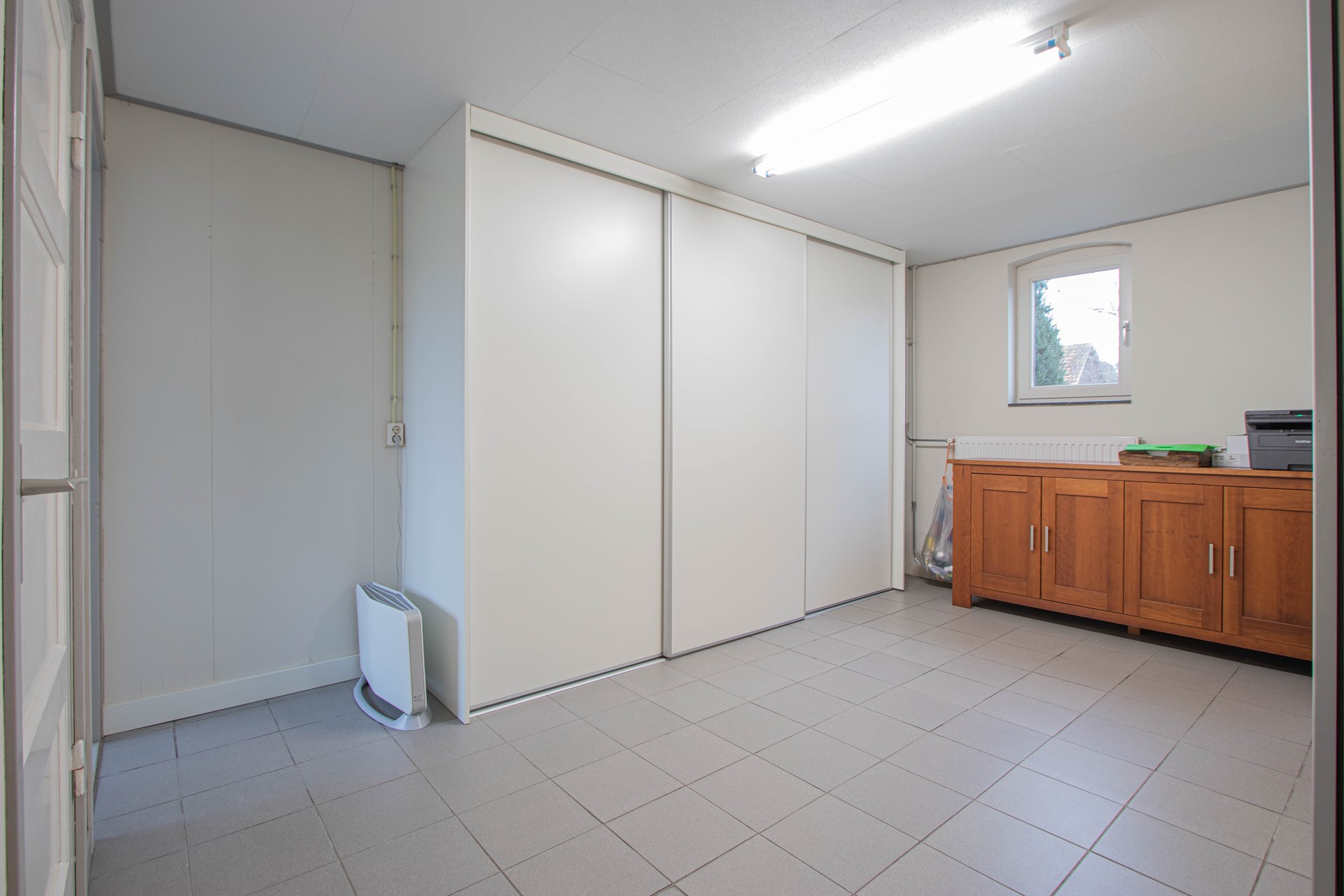 Begane vloer Overdekte toegang middels serre, woon-/ eetkamer met open keuken, badkamer, multifunctionele (kantoor, slaap-/ of werkkamer) en praktische berging met witgoed en stookruimte. Middels open trap in de woonkamer is de verdieping bereikbaar.