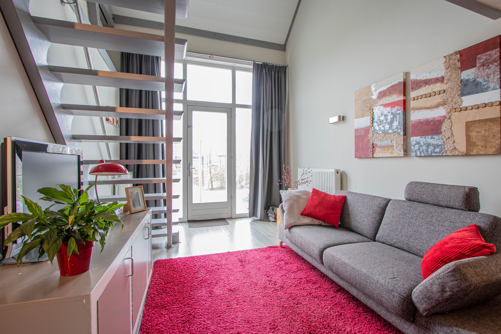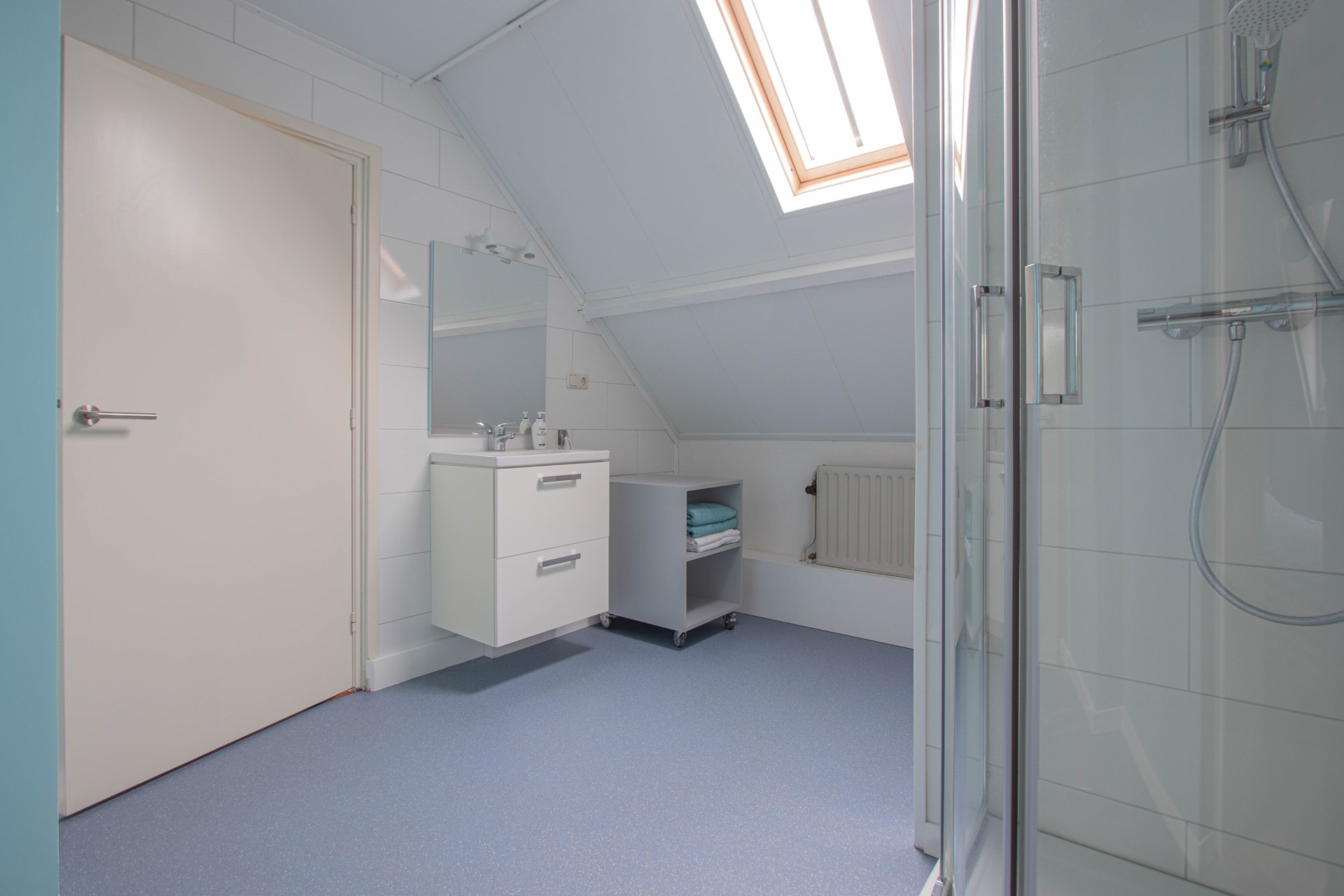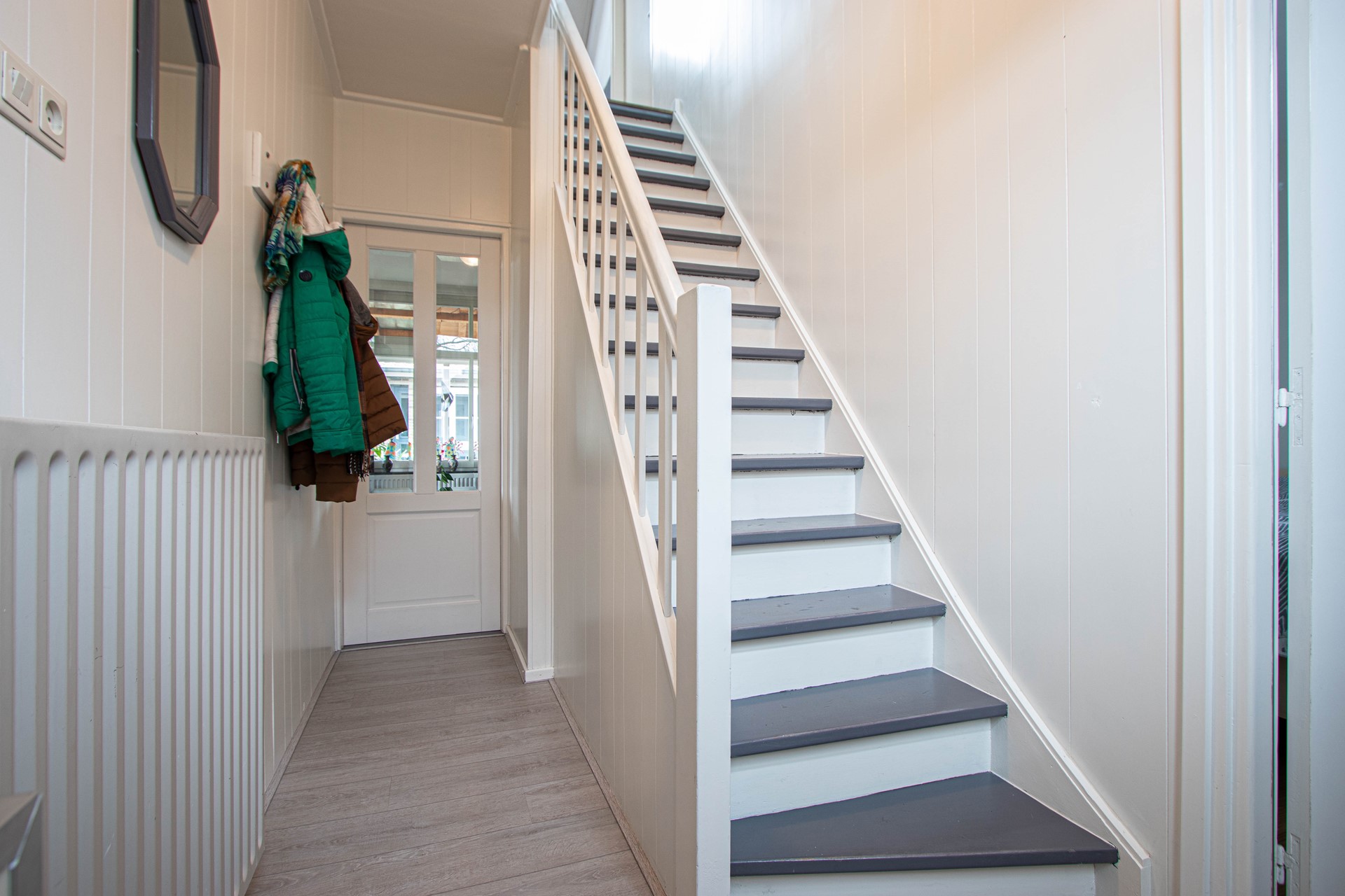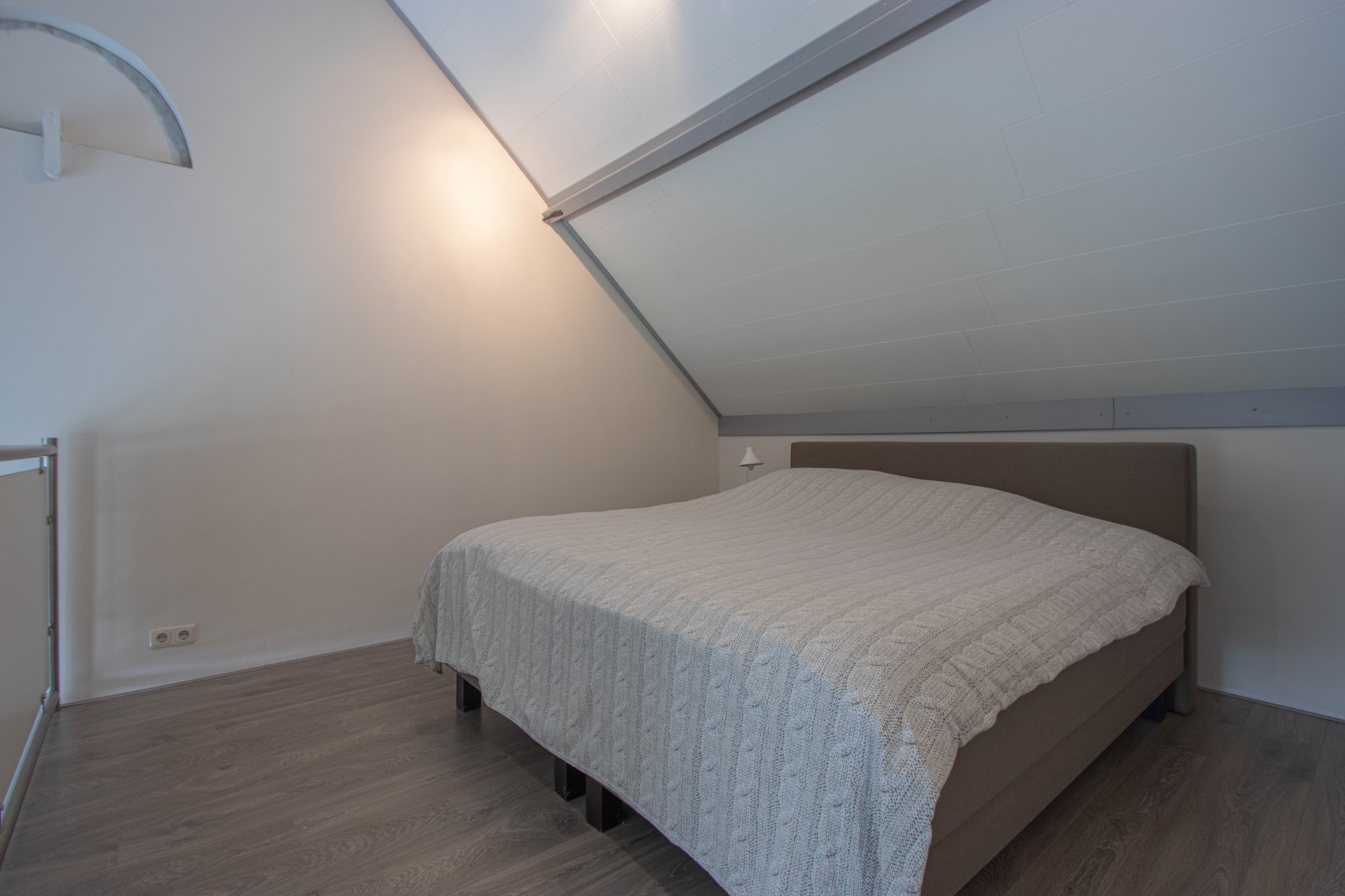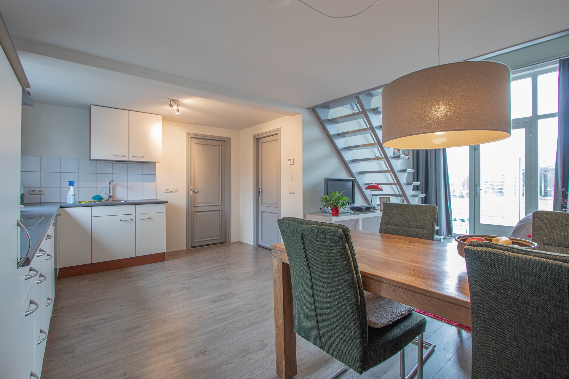 Bij binnenkomst stap je gelijk in de sfeervolle eet- en woonkamer met een open keuken, in deze ruimte zit ook de vaste trap om naar boven te kunnen. Gelegen aan de mooie woonkamer is de eerste royale slaapkamer. Er is een Ruime badkamer met een inloopdouche, toilet, en een dubbele wastafel. Daar bij gelegen is de waskamer met witgoedaansluiting. De bovenverdieping bestaat uit een RIANTE tweede slaapkamer. Er bevind zich een deur die naar het inpandig terras leid die volledig omringd is met glazen wanden met een deur om de tuin te betreden
