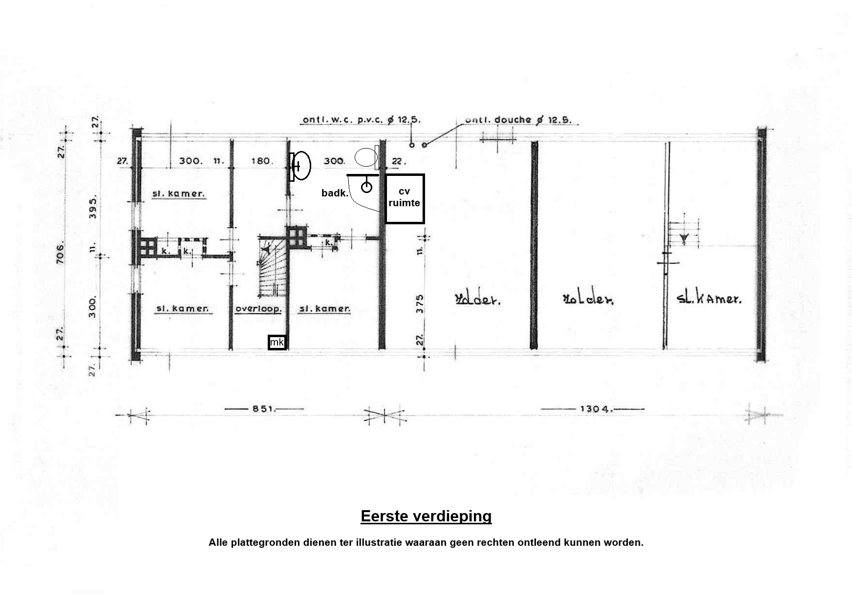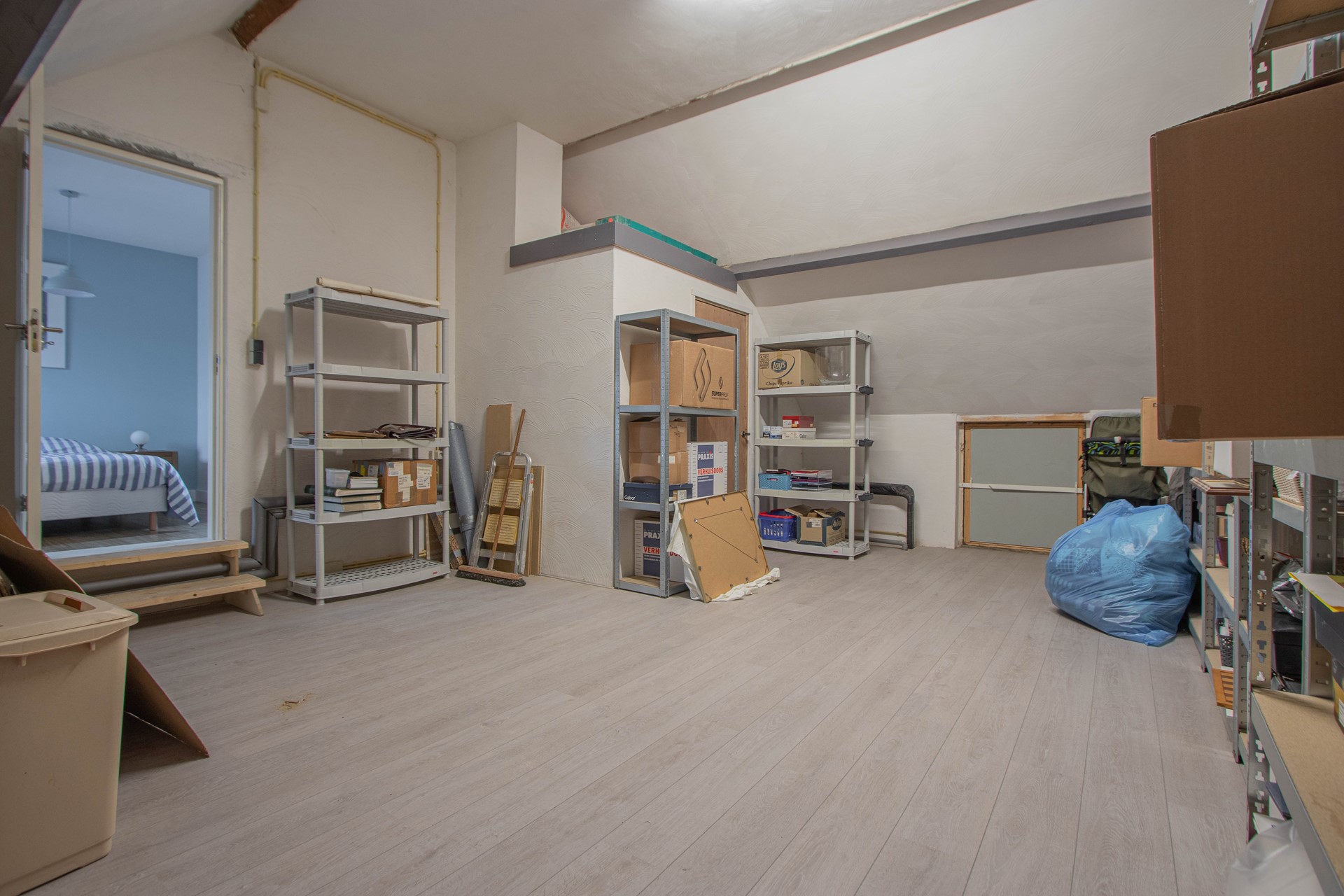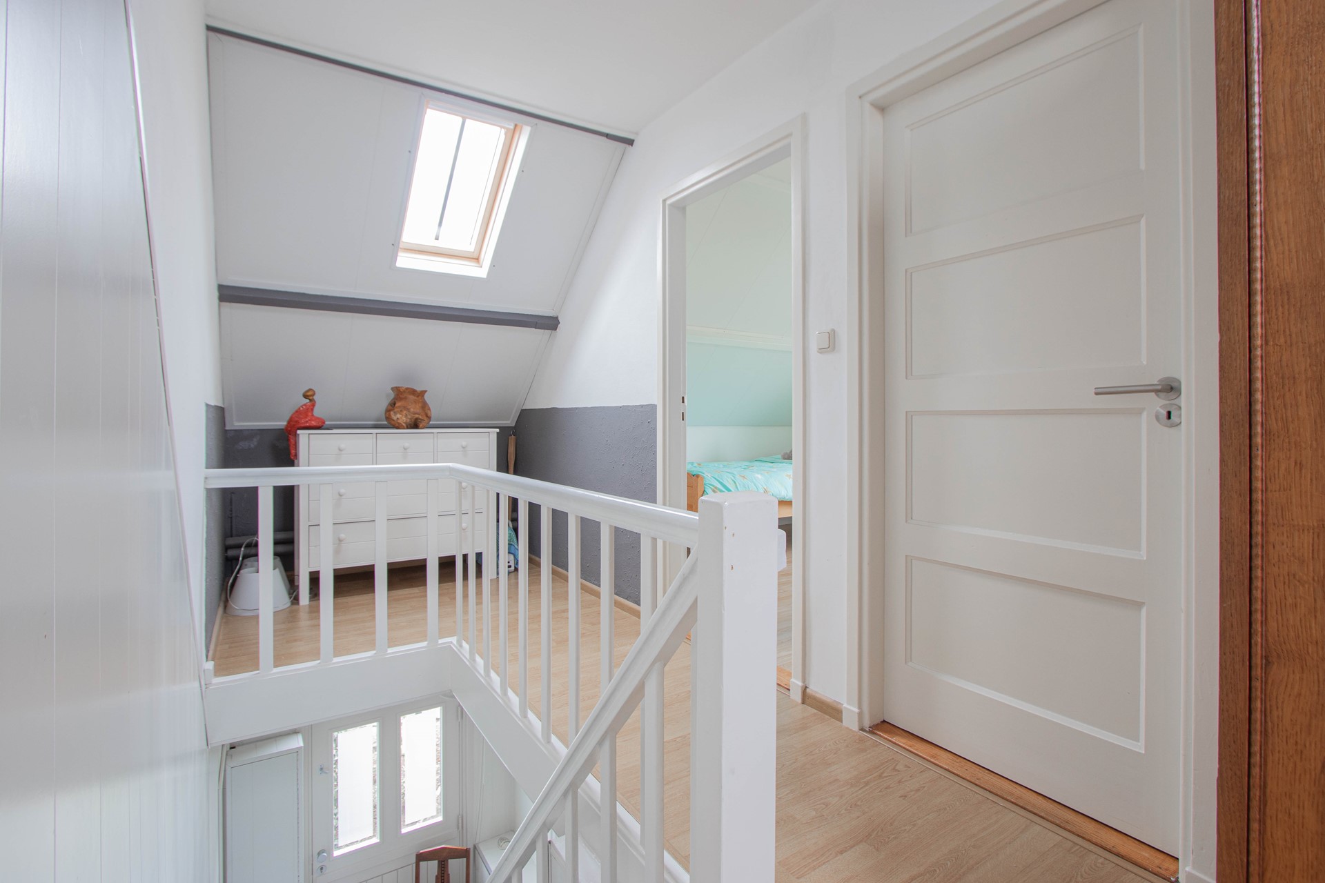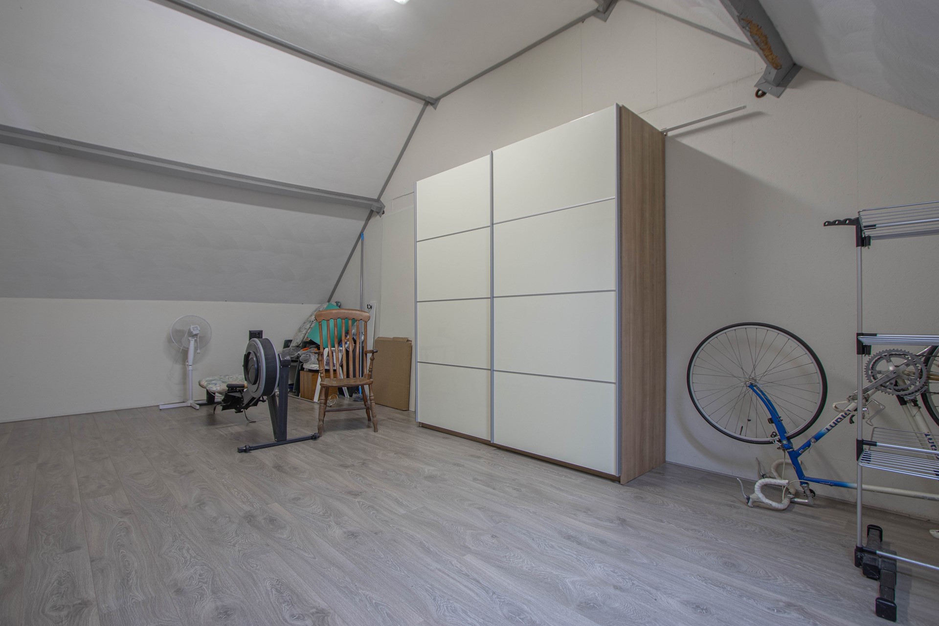 Eerste verdieping Overloop met twee slaapvertrekken – badkamer met ensuite derde slaapkamer en mega opbergzolder (ca. 7,0x5,1m) met stookruimte.