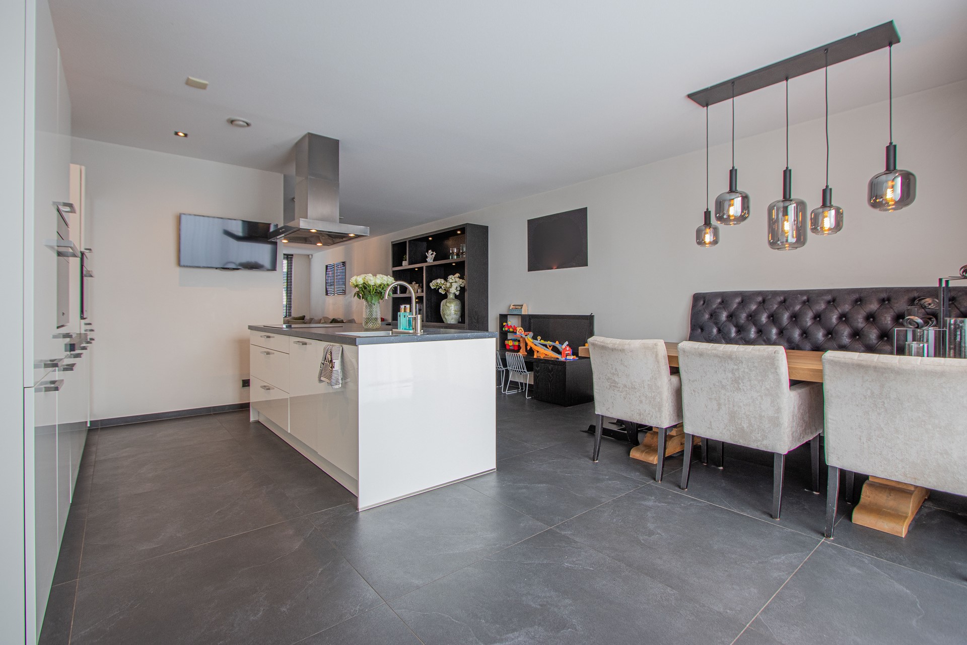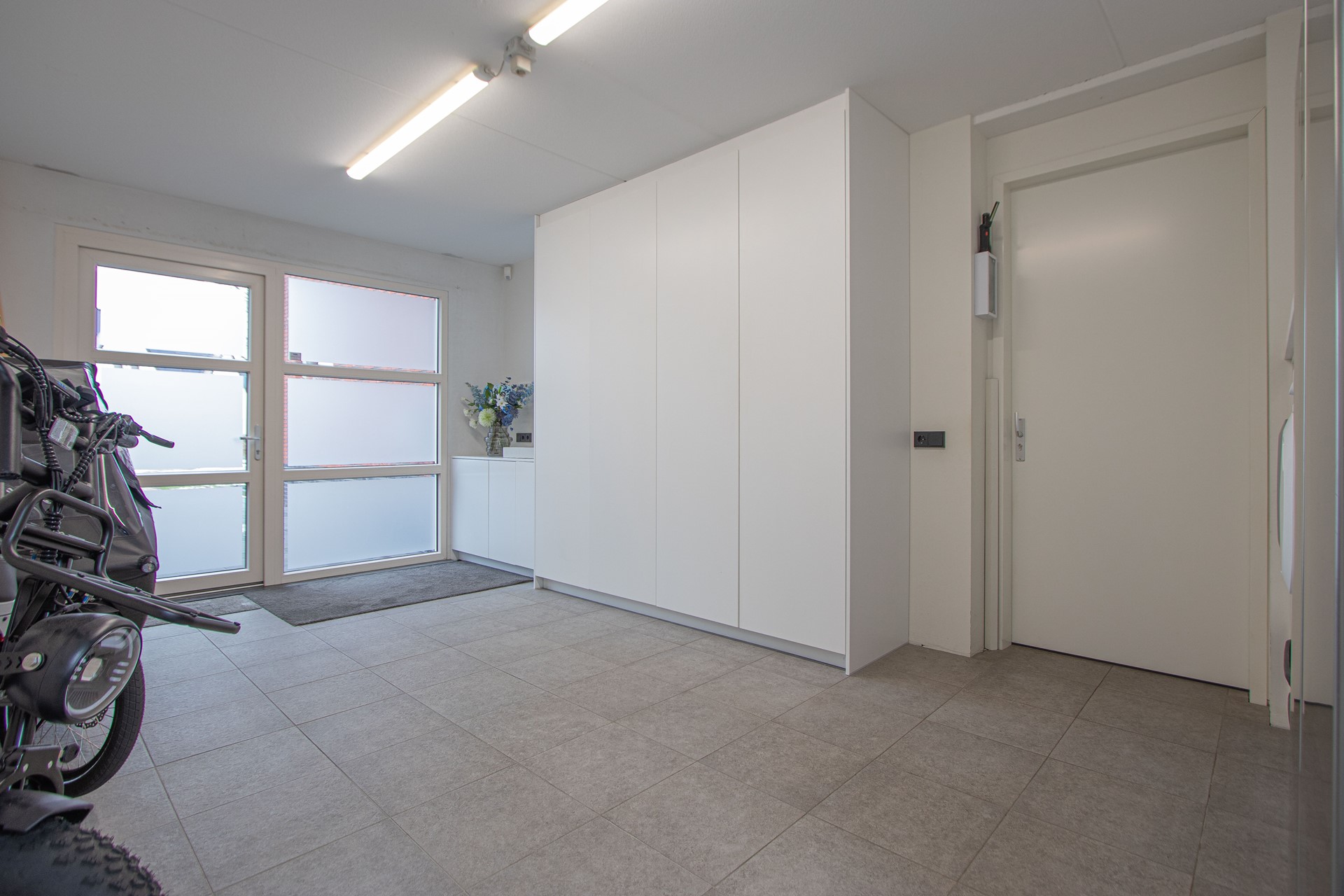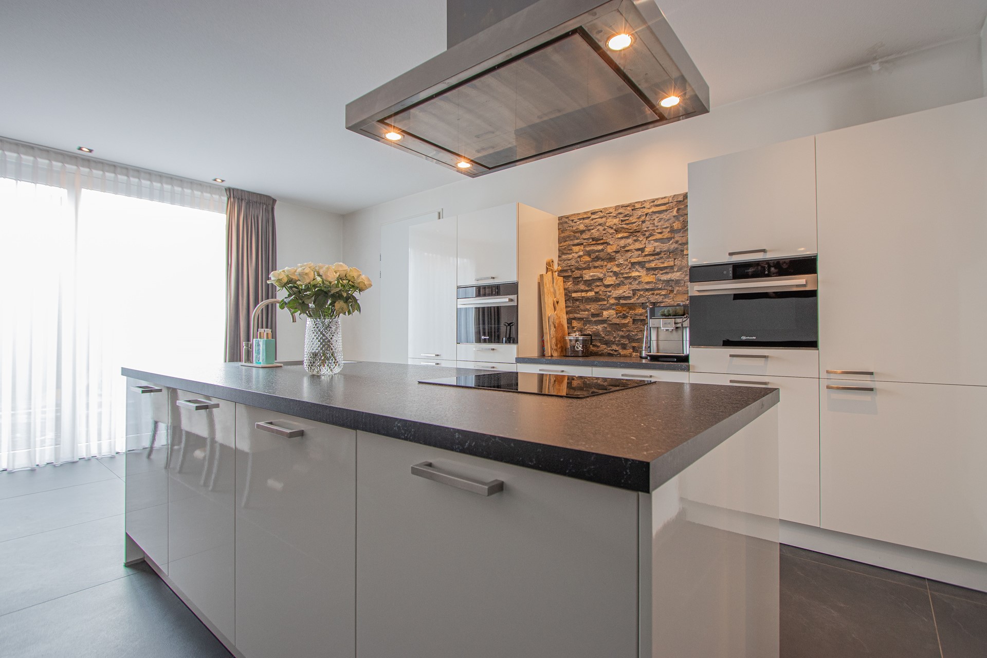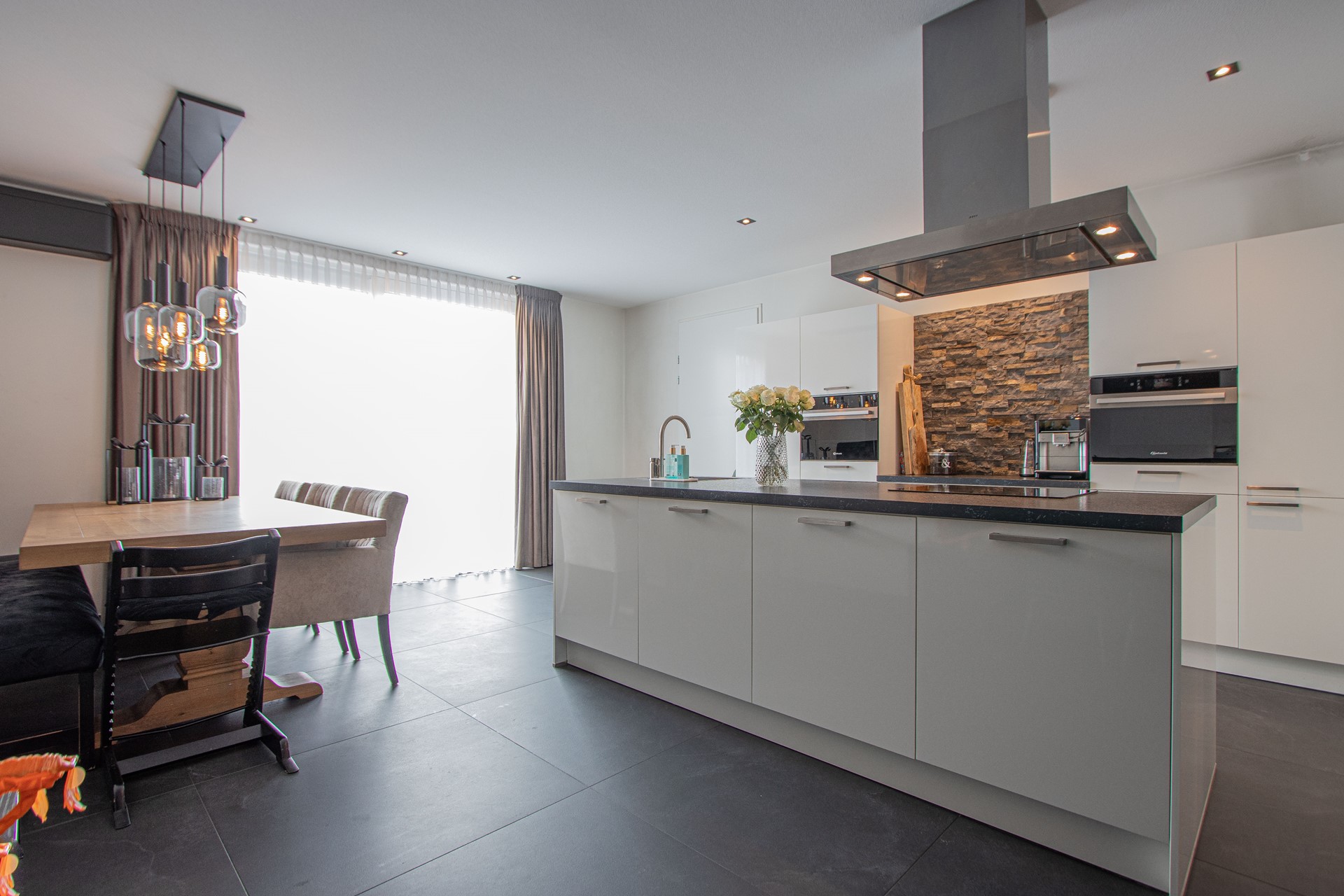 Via de entree kom je binnen in de verzorgde hal met luxe trapafwerking, meterkast, alarminstallatie, camera’s (ter overname) en een modern toilet met fonteintje. Vanuit de hal is toegang tot de royale woonruimte, die is afgewerkt met een strakke antracietkleurige (90x90cm) tegelvloer en is voorzien van comfortabele vloerverwarming. De wanden zijn strak gestukt en in de woonkamer is een prachtige maatwerk tv-kastenwand met sfeerhaard (ter overname) aanwezig. De natuurstenen vensterbanken zorgt voor een luxe en een rustige uitstraling in het geheel. De woonkamer biedt volop ruimte voor een comfortabele zithoek en staat in open verbinding met de eetkamer en de FENOMENALE LEEFKEUKEN met KOOKEILAND. Deze bevinden zich aan de achterzijde van de woning waarbij de grote schuifdeur zorgt voor een mooie lichtinval en AIRCO. De SUPER-DE- LUXE KEUKEN vormt het hart van de woning en is uitgevoerd met een KOOKEILAND en diverse inbouwapparatuur, welke bestaat uit o.a. combi magnetron, stoomoven, vaatwasser, koelkast ,diepvries en een inductiekookplaat met RVS afzuigkap. Daarnaast beschikt de keuken over veel bergruimte en een praktisch werkblad, ideaal voor dagelijks gebruik én uitgebreide diners met familie en vrienden. Vanuit de keuken is multifunctionele ruimte (oudsher garage) te bereiken, ideaal voor de ondernemers voor een praktijk of salon aan huis van ruim 21m². Deze ruimte is volledig geïsoleerd, voorzien van witgoedaansluitingen met over te nemen kastenwanden en wastafel.