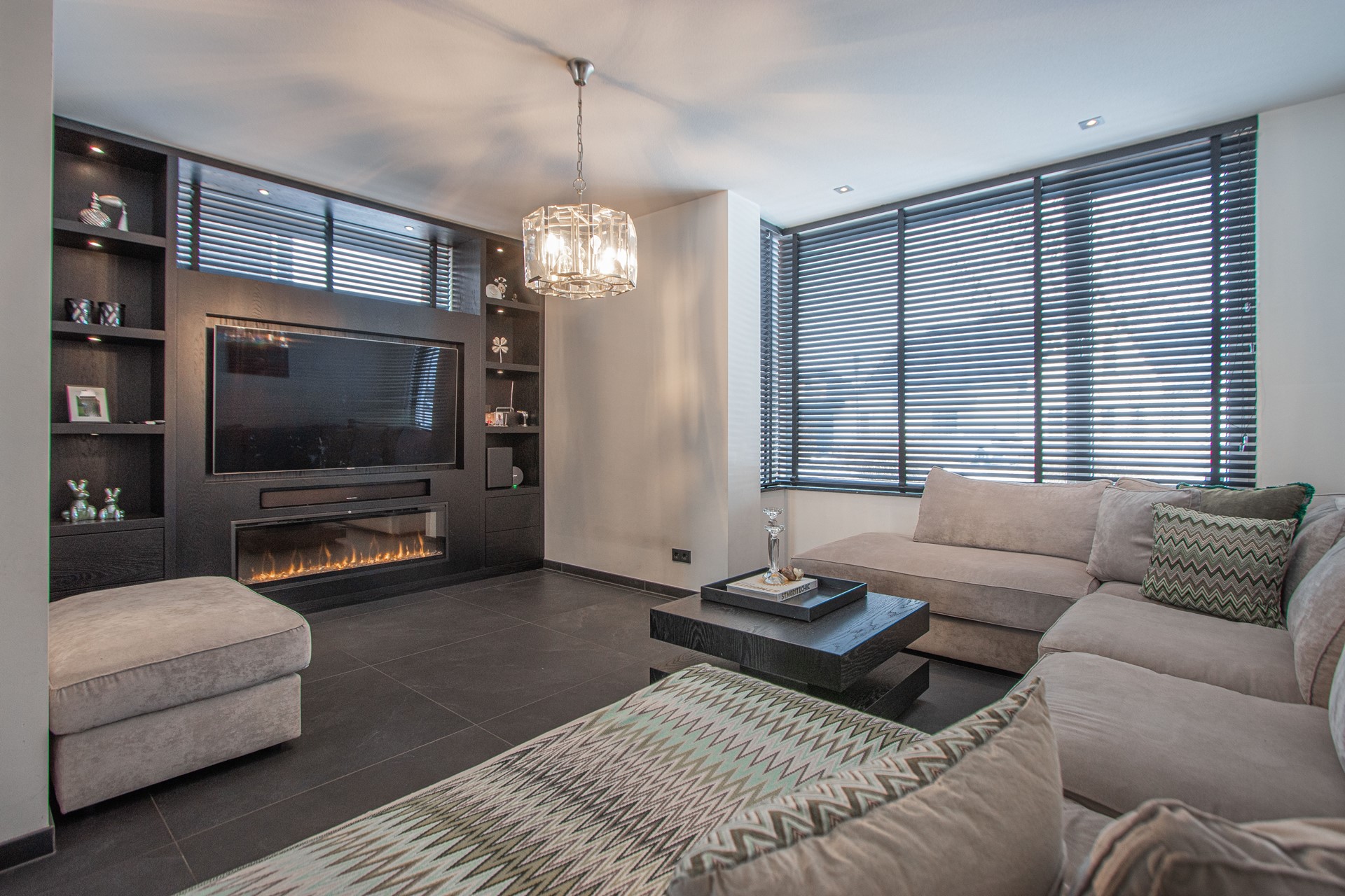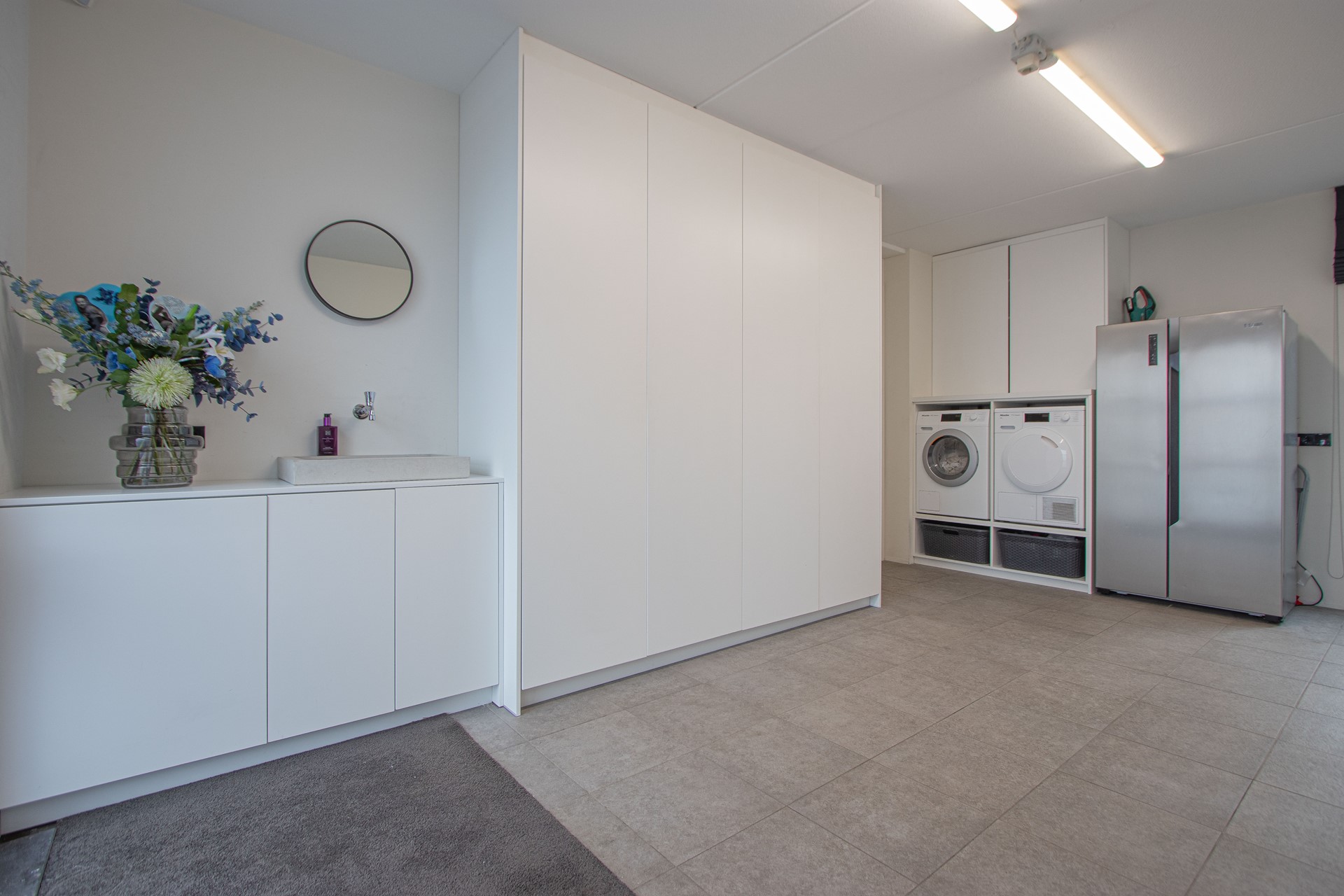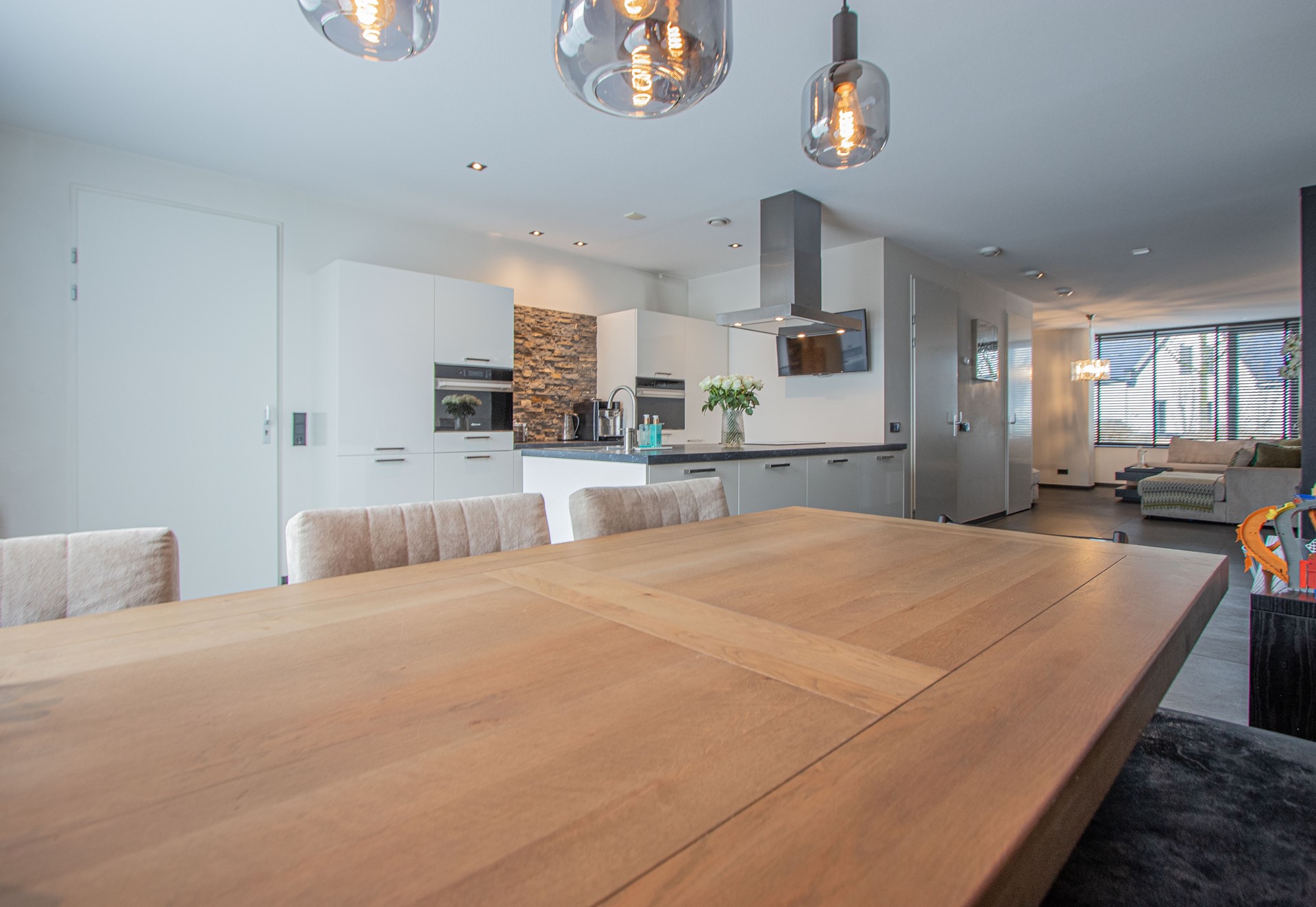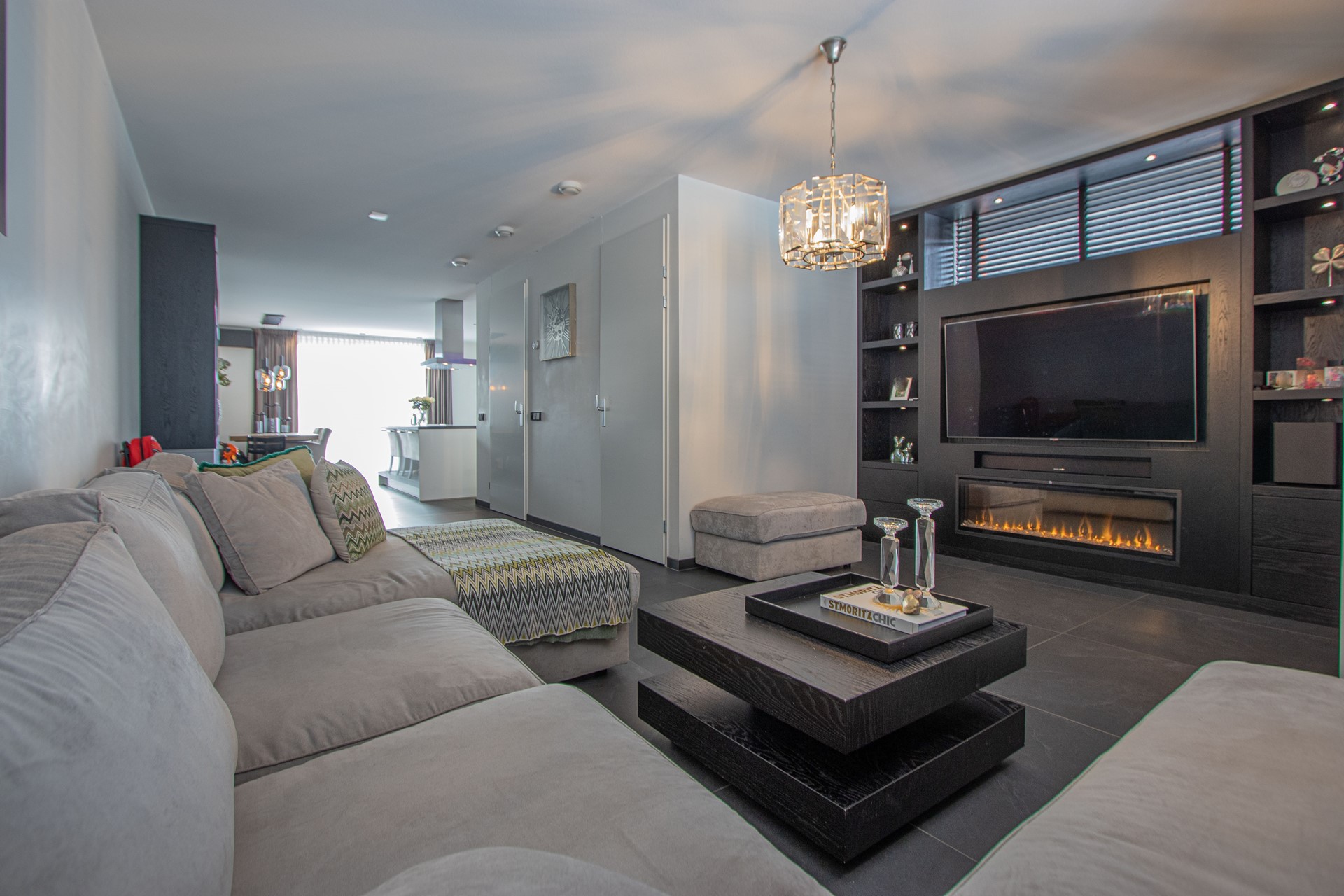 Via de entree kom je binnen in de verzorgde hal met luxe trapafwerking, meterkast, alarminstallatie, camera’s (ter overname) en een modern toilet met fonteintje. Vanuit de hal is toegang tot de royale woonruimte, die is afgewerkt met een strakke antracietkleurige (90x90cm) tegelvloer en is voorzien van comfortabele vloerverwarming. De wanden zijn strak gestukt en in de woonkamer is een prachtige maatwerk tv-kastenwand met sfeerhaard (ter overname) aanwezig. De natuurstenen vensterbanken zorgt voor een luxe en een rustige uitstraling in het geheel. De woonkamer biedt volop ruimte voor een comfortabele zithoek en staat in open verbinding met de eetkamer en de FENOMENALE LEEFKEUKEN met KOOKEILAND. Deze bevinden zich aan de achterzijde van de woning waarbij de grote schuifdeur zorgt voor een mooie lichtinval en AIRCO. De SUPER-DE- LUXE KEUKEN vormt het hart van de woning en is uitgevoerd met een KOOKEILAND en diverse inbouwapparatuur, welke bestaat uit o.a. combi magnetron, stoomoven, vaatwasser, koelkast ,diepvries en een inductiekookplaat met RVS afzuigkap. Daarnaast beschikt de keuken over veel bergruimte en een praktisch werkblad, ideaal voor dagelijks gebruik én uitgebreide diners met familie en vrienden. Vanuit de keuken is multifunctionele ruimte (oudsher garage) te bereiken, ideaal voor de ondernemers voor een praktijk of salon aan huis van ruim 21m². Deze ruimte is volledig geïsoleerd, voorzien van witgoedaansluitingen met over te nemen kastenwanden en wastafel.