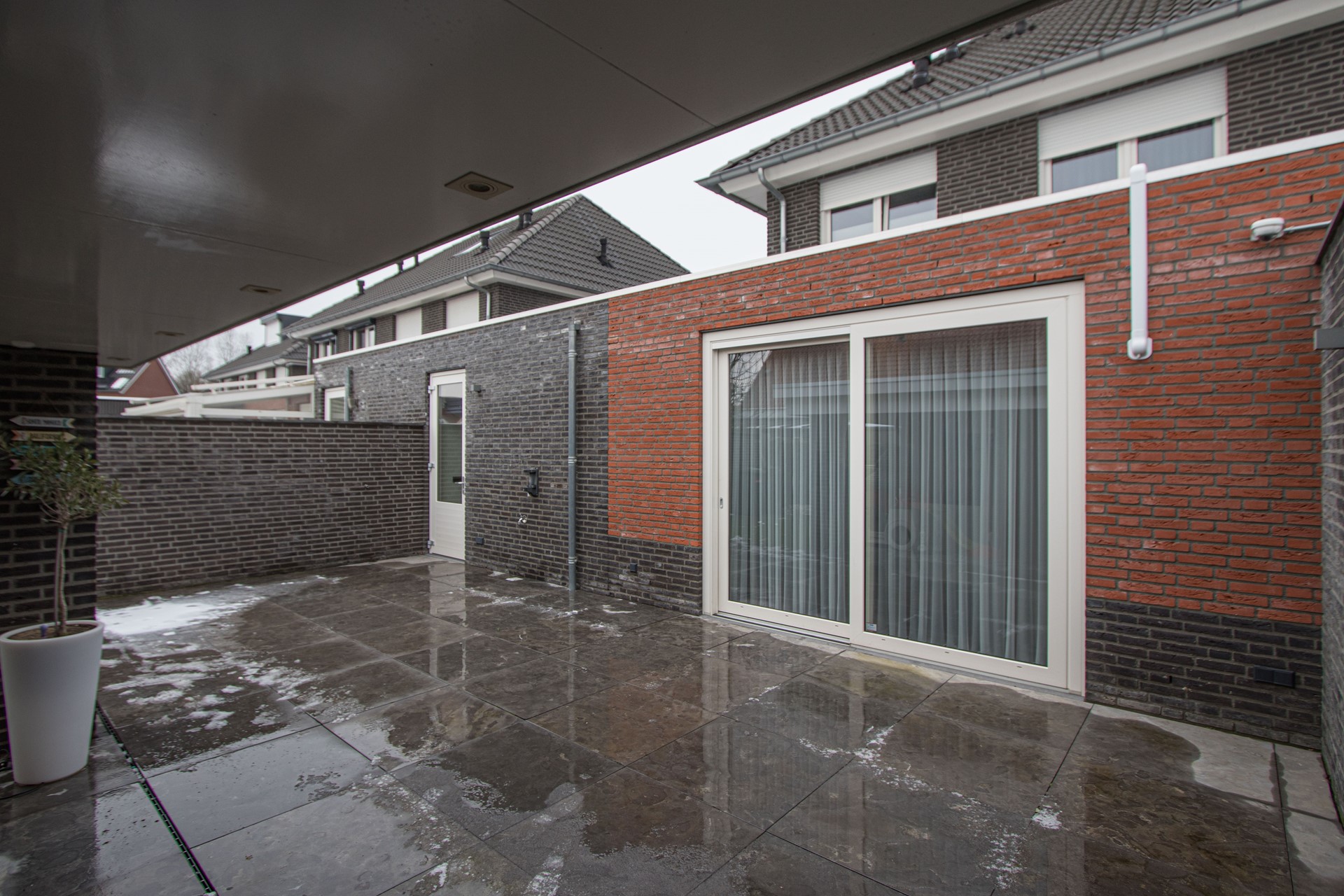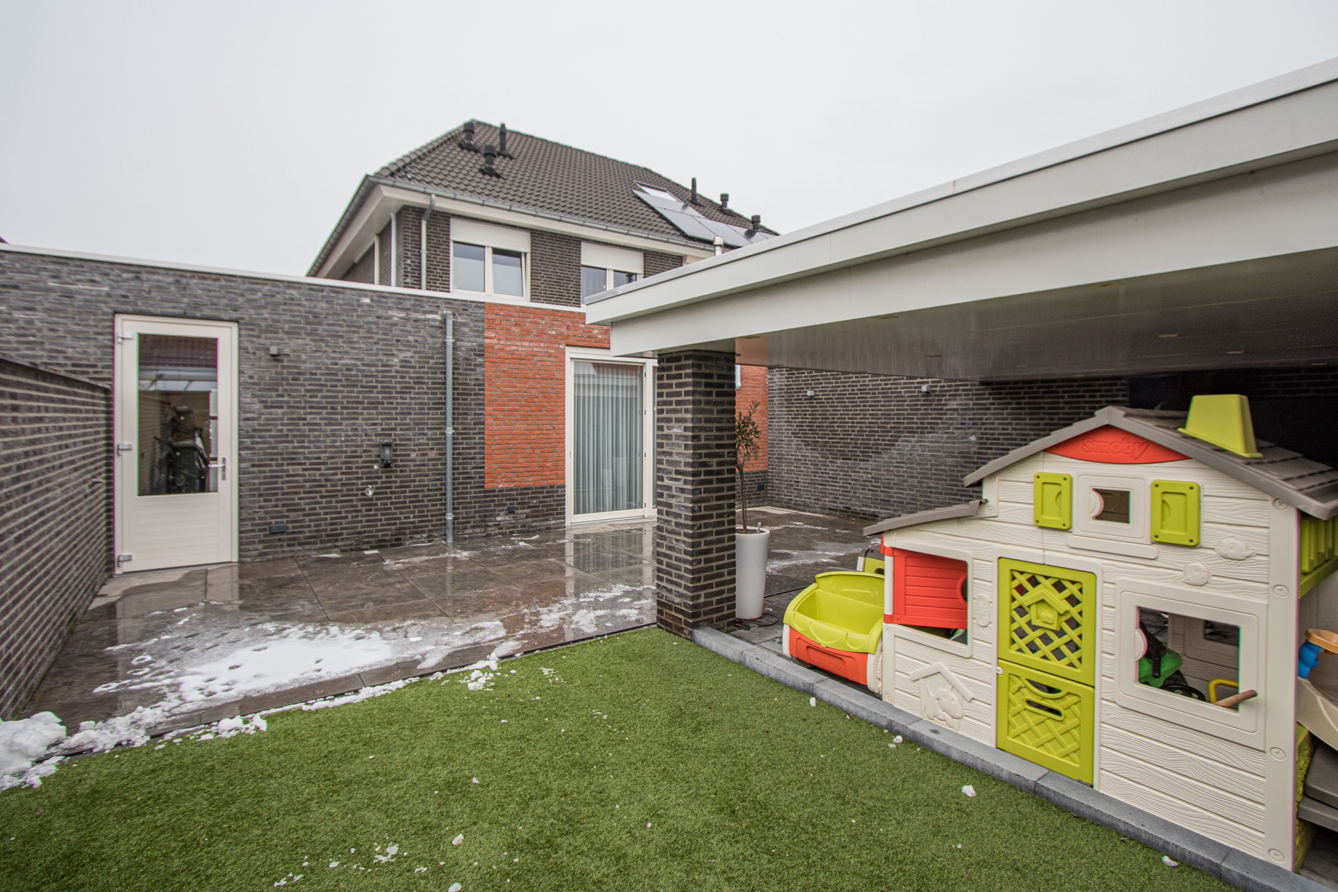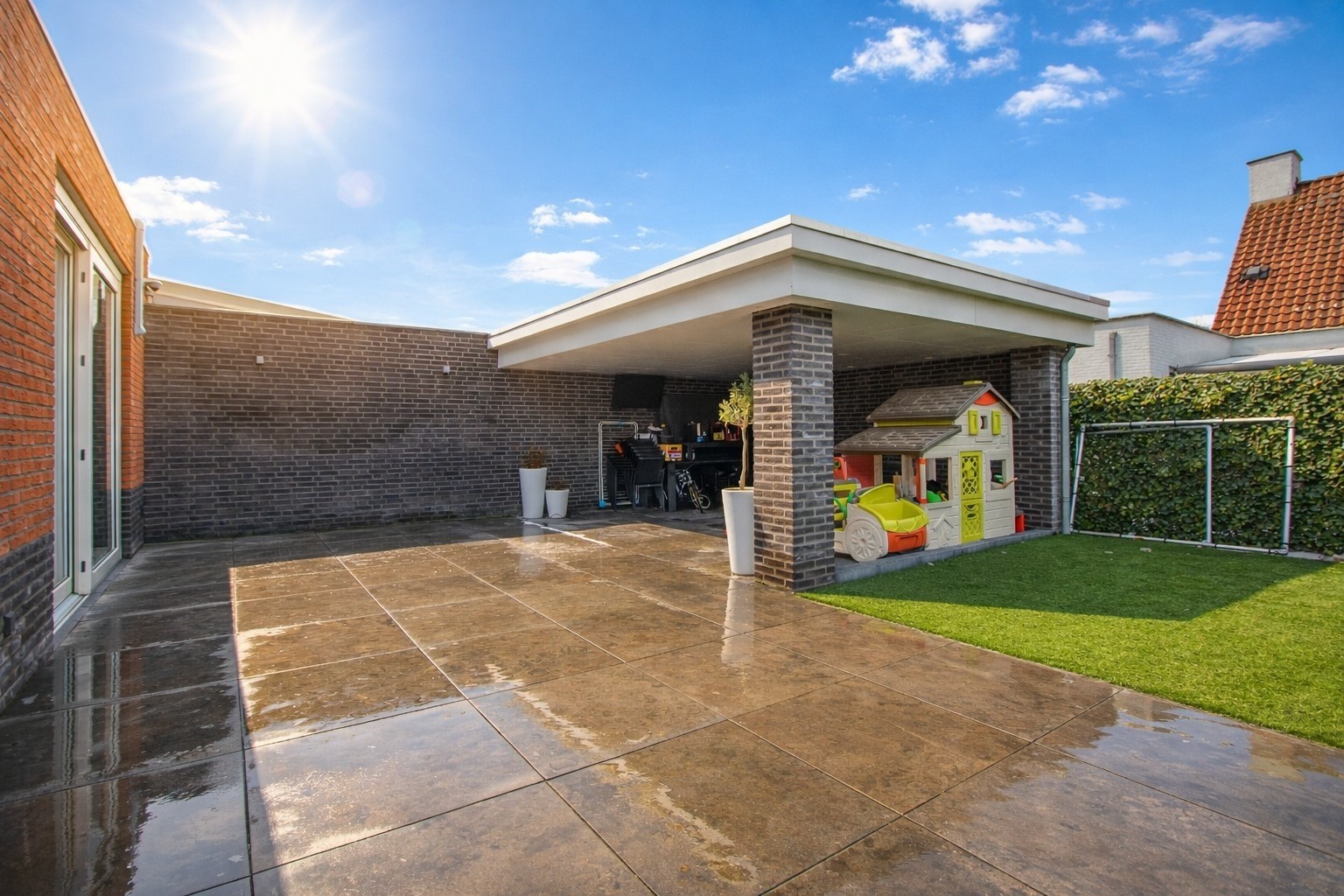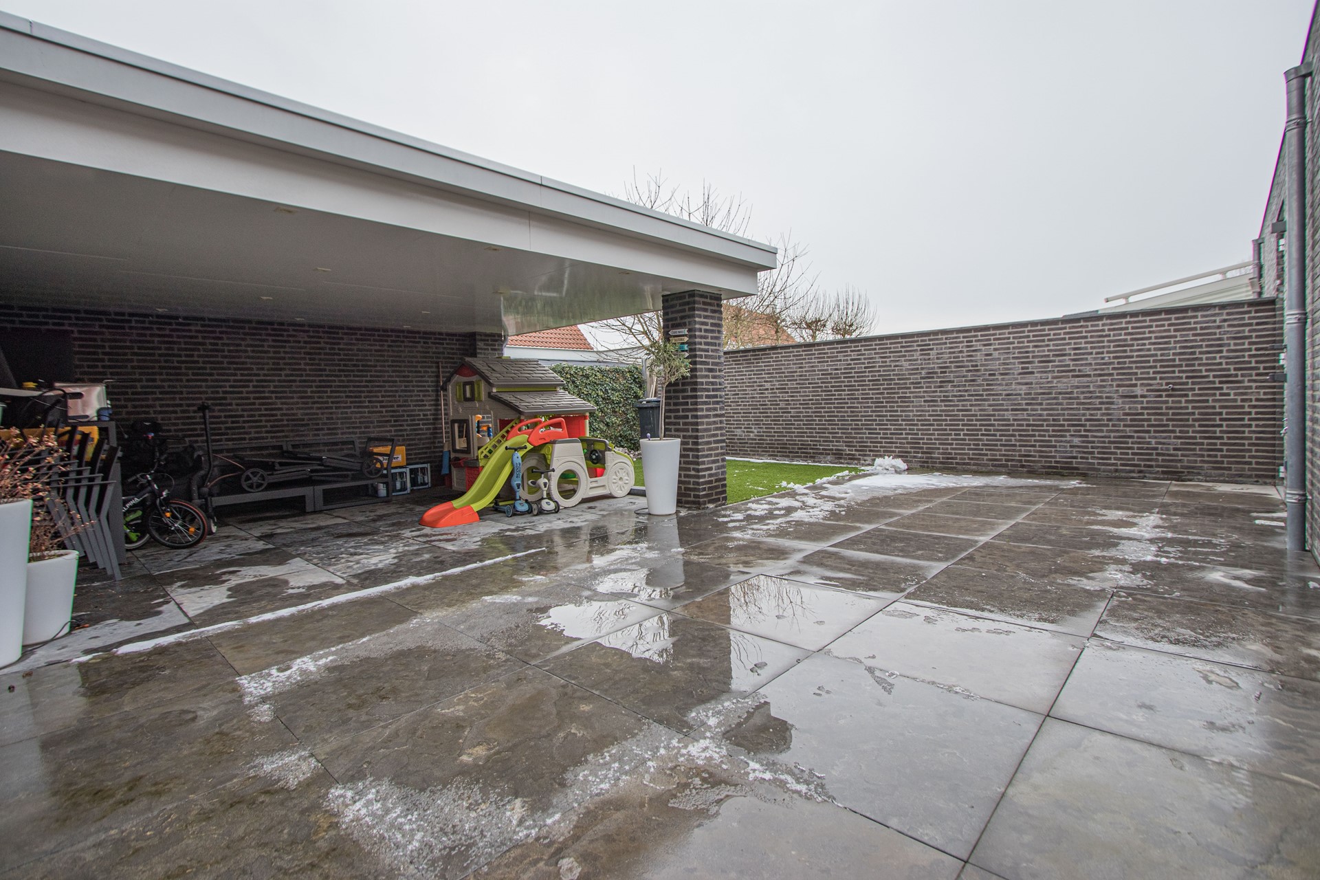 Volledig omsloten achtertuin– onderhoudsvriendelijk aangelegde tuin met terras – prachtige terrasoverkapping (22m2) – kunstgras en aan de voorzijde een lange oprit en keurig aangelegde voortuin.