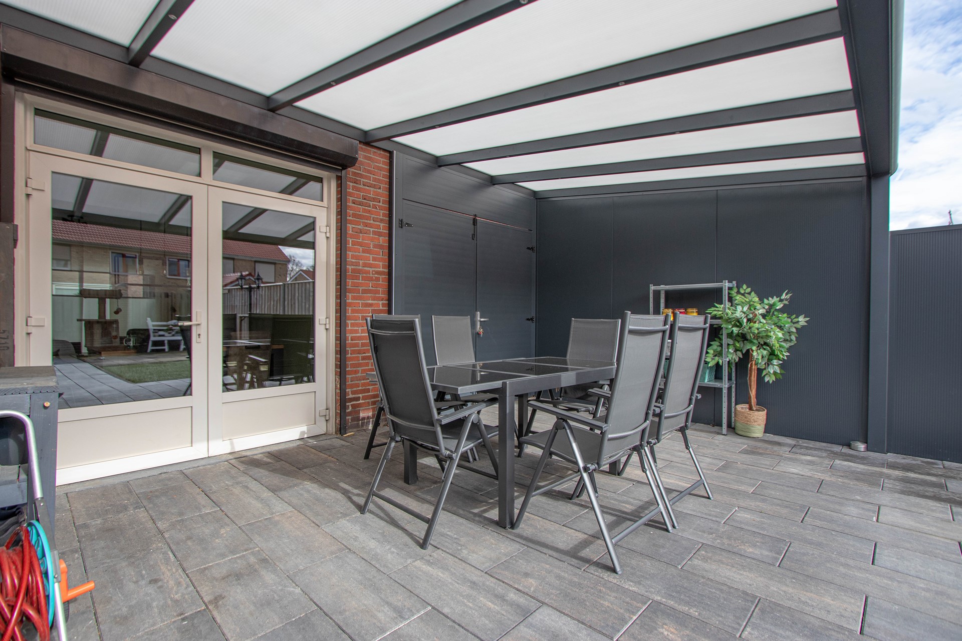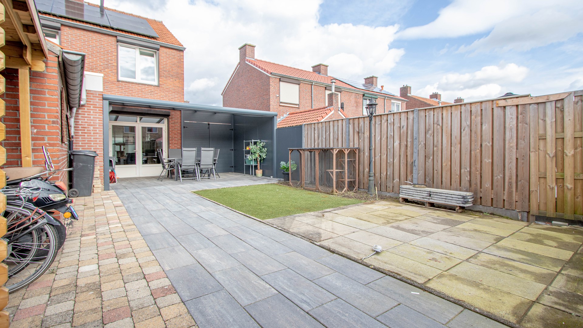 Optimale privacy biedende achtertuin met houten berging en carport voor fietsen/scooters, fenomenale terrasoverkapping, onderhoudsvriendelijk aangelegd met kunstgras, twee mogelijkheden om de achtertuin te bereiken en geheel omsloten middels schutting.