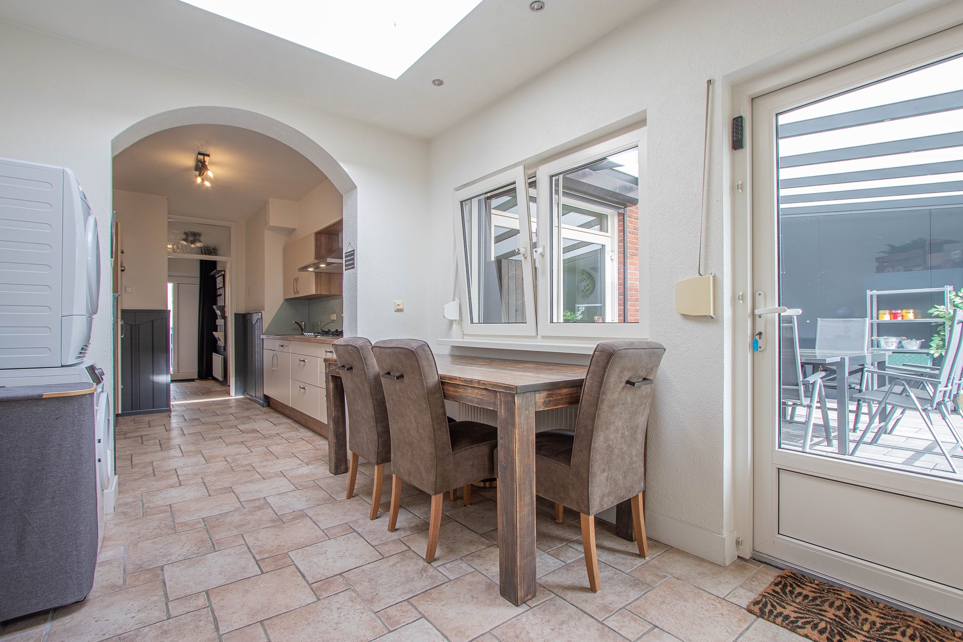 Begane grond Entree/hal, toiletruimte, garderobe, meterkast, eet-/woonkamer, leefkeuken met multifunctionele aanbouw met witgoedaansluiting en inpandige berging.