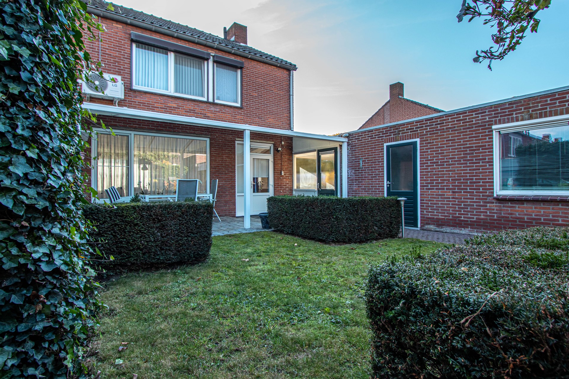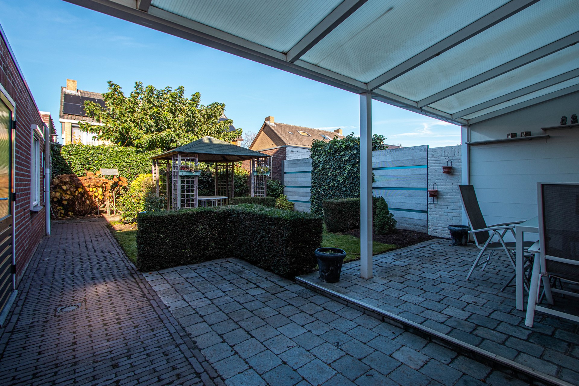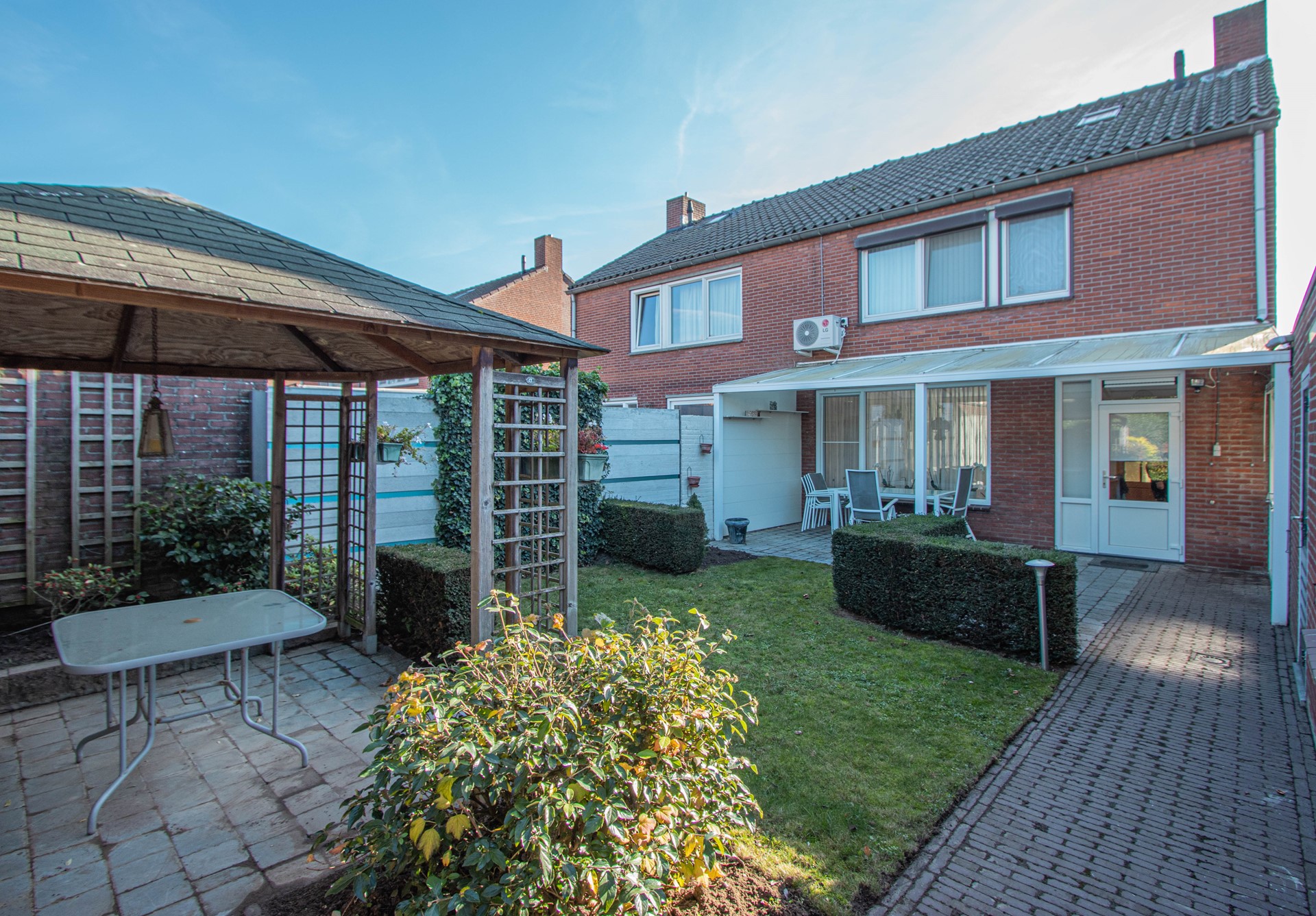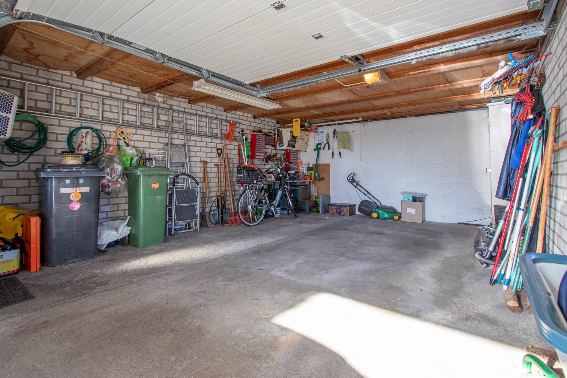 Bij binnenkomst in de ruime ontvangsthal met garderobe, meterkast en toiletruimte met fonteintje is toegang tot de keuken en opgang naar de eerste verdieping. De halfopen keuken is praktische ingericht en uitgerust met diverse inbouwapparatuur en speels barretje. De lichte woonkamer heeft een warme uitstraling dankzij de mooie laminaatvloer, grote raampartijen en de airco (2023) die zorgt voor een aangenaam klimaat in elk seizoen. Vanuit de keuken heb je direct toegang tot de tuin, waardoor koken en buitenleven hier moeiteloos in elkaar overlopen. Op zomerse dagen zet je gewoon de deur open en geniet je van het zonnetje terwijl het diner op het fornuis staat. De tuin en fenomenale terrasoverkapping is een fijne verlenging van de leefruimte: verzorgd aangelegd met een gezellig terras, een groene grasstrook en kleurrijke beplanting. Dankzij de ligging op het zuidoosten kun je hier van de ochtend tot laat in de middag heerlijk van de zon genieten. Achter in de tuin vind je een prieeltje was het heerlijk toeven is. Achter de garage is nog een praktische bijkeuken waar zich thans de witgoedaansluitingen bevinden. De garage is ruim 27m² en ideaal voor doe-het-zelvers, hobbyisten, autoliefhebbers of gewoon voor fietsen e.d. Aan de linkerzijde is een loopdeur en via de (kleine) carport is eveneens de achtertuin te bereiken vanaf de extra brede oprit. Deze is perfect voor de caravan, camper of bedrijfsauto. De voortuin is verzorgd aangelegd met diverse aanplant en vanuit de woonkamer heb je zicht over de brede straat.
