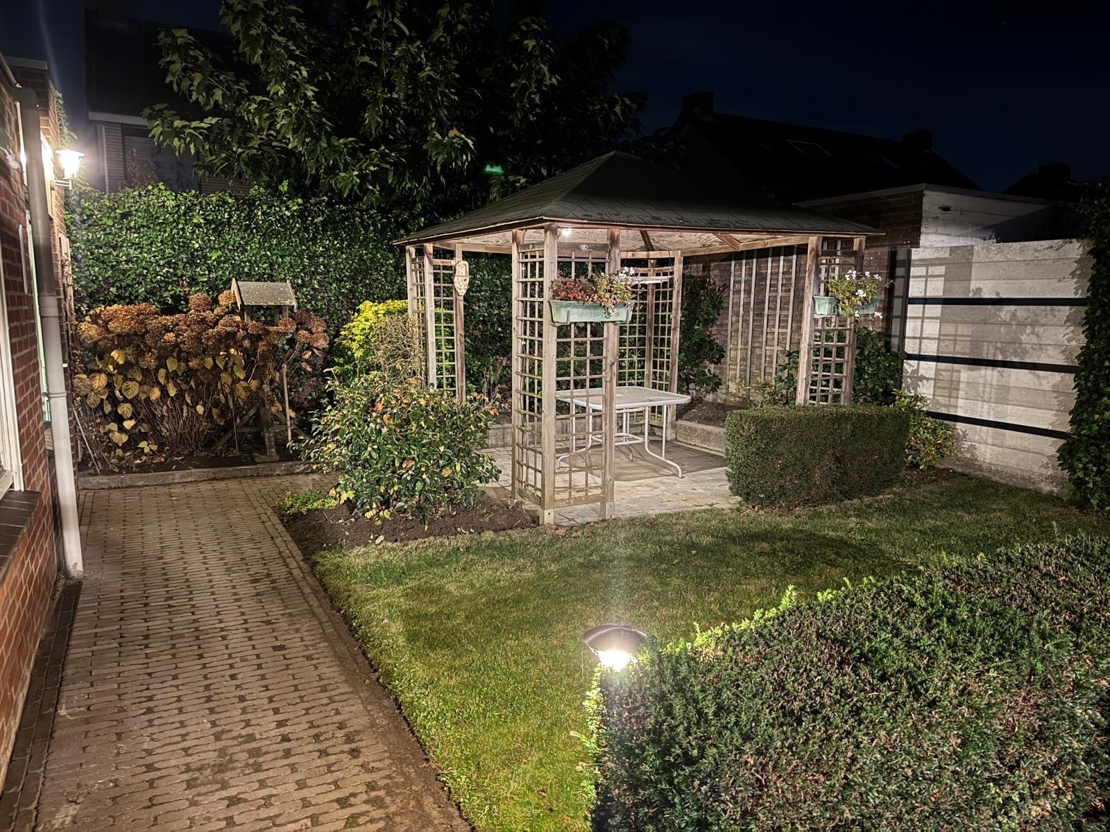 Verzorgde tuin met veel privacy – terrasoverkapping – graszode - borders met diverse aanplant – prieeltje en geheel omsloten met eigen achterom.